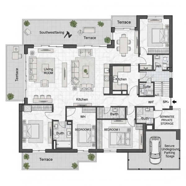 Nieruchomość ma elegancki układ i dobrze zdefiniowane przestrzenie. Ma zamkniętą powierzchnię stu czterdziestu czterech metrów i czterdziestu decymetrów kwadratowych, uzupełnioną zadaszonym tarasem o powierzchni sześćdziesięciu metrów i dziewięciu decymetrów kwadratowych oraz odkrytym tarasem o powierzchni ośmiu metrów i czternastu decymetrów kwadratowych. Dodatkowo obejmuje pralnię o powierzchni trzech metrów i osiemnastu…