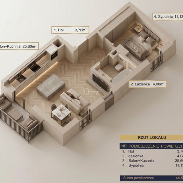 MIKATO APARTMENT – MODERN LIFESTYLE IN THE CENTER OF EVENTS Highest architectural standards | Functionality | Proximity to the business heart of Katowice | Urban energy | Developer’s standard ***** ROOM LAYOUT: * Living room with kitchenette (26.12 m²)* comfortable bedroom (10.27 m²)* room (13.96 m²),* room (9.69 m²),* well-appointed…