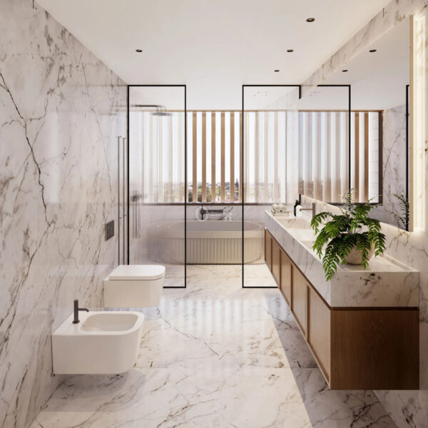 The kitchens are equipped with top-quality appliances from renowned brands BORA, Liebherr and Gaggenau. Each kitchen has storage space for dishes and appliances, as well as a dining area, optimizing the functionality of the space. The balconies provide a spacious terrace, finished in natural travertine, creating an elegant yet natural atmosphere.