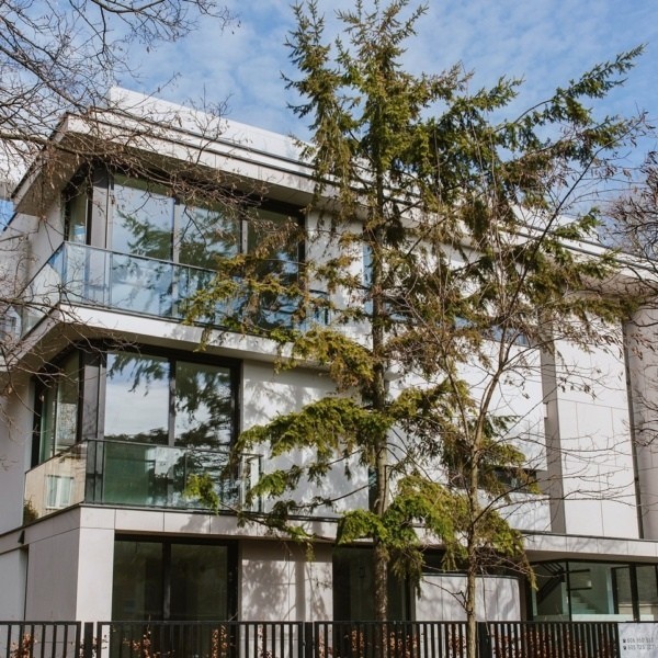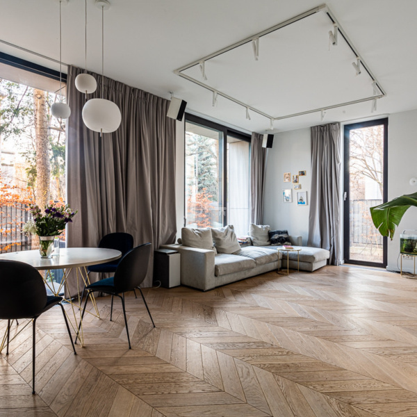 Situated among modernist villas of the early 20th century, this prestigious investment perfectly blends in with a geometric minimalist shape and toned facade. It accommodates only three apartments, two 140 square meters and one 120 square meters, on ground floor, with adjacent garden. Project designed by MAG Architekci Marcin Grzyb.
