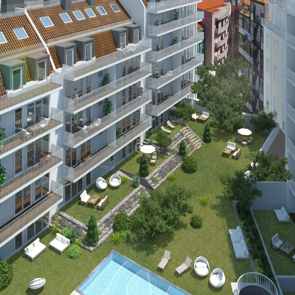 DUQUE 70 is the result of the rehabilitation of 4 historic and traditional buildings, adapted to the comfort needs of modern life. The outcome of this project opens the doors to a closed residential condominium, with 52 apartments with high-quality finishing, a serene interior garden shared by all apartments, swimming pools and large areas to move around in. Four historic and traditional buildings in the centre of Lisbon.