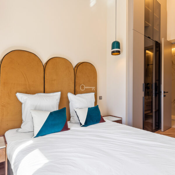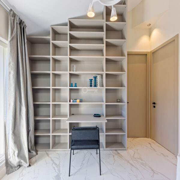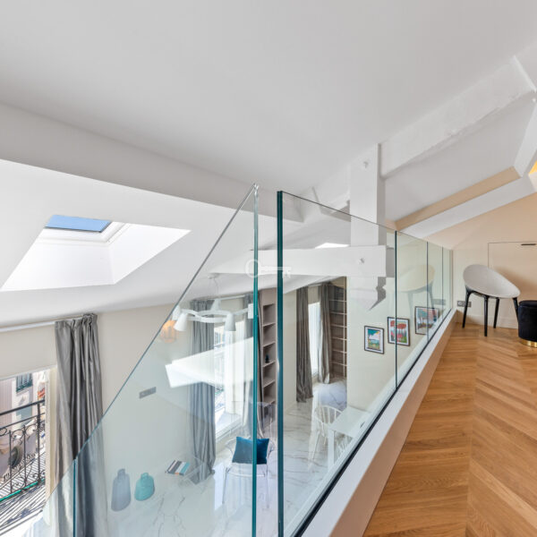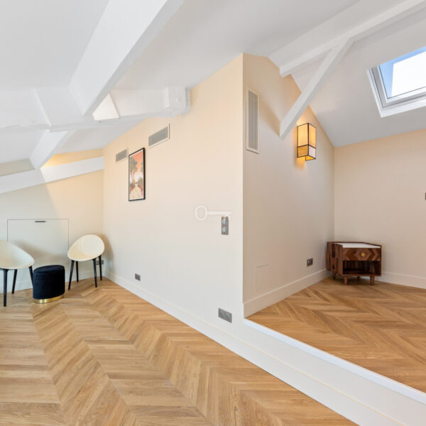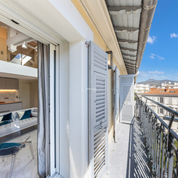 The bright 37 m² living room with open kitchen opens onto a large balcony with panoramic views of Nice and the Cimiez hills. A white lacquered steel staircase leads to a spacious mezzanine. Two bedrooms with en-suite bathrooms and closets also lead out to the balcony.