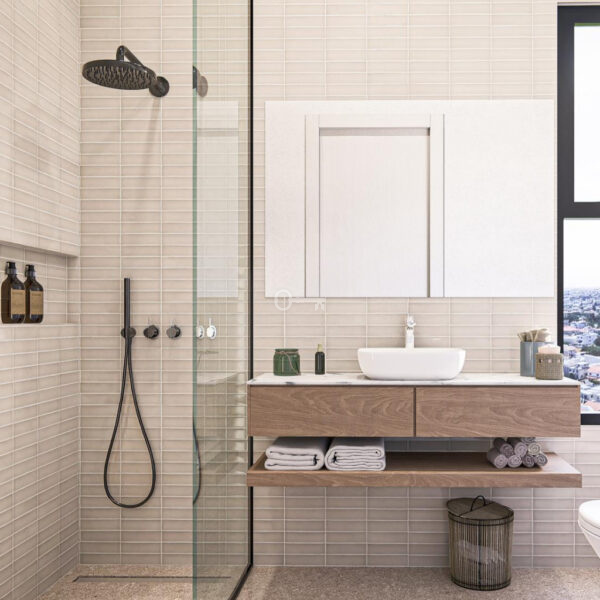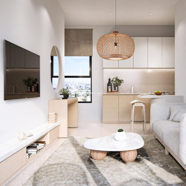 This elegant, modern development consists of a residential block of studio, 1 and 2 bedroom apartments and a commercial block with offices and stores. The residential block consists of 11 studio apartments, 8 one-bedroom apartments and 6 two-bedroom apartments.