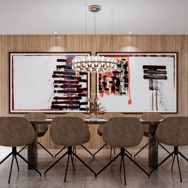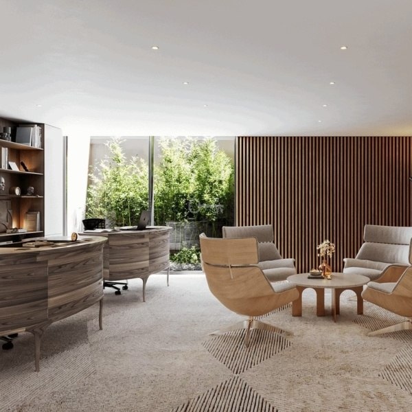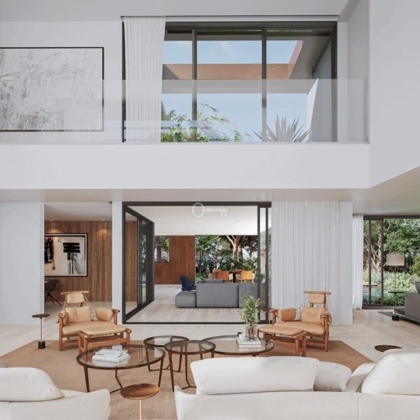 *spacious interiors with large glazing, marble and natural wood,