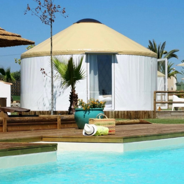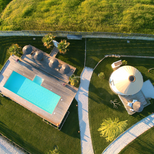 They are four guest rooms and each one offers an area of 24 sqm: they are contemporary yurts (French manufacturer) with undeniable charm. All yurts have a shower room, separate toilet and a private teak terrace with views of the estate. Construction on concrete slab, tent with insulation. Features: reversible air-conditioning, parquet floor, double glazing bay windows. The yurts are pleasantly located near the swimming pool 12 x 4 in salt, illuminated (unheated) with teak beach.