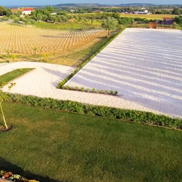 – An outdoor dressage arena (60 x 20), sand-fiber floor placed in the axis of the swimming pool and lined with poplars. Watering system, no lighting.
