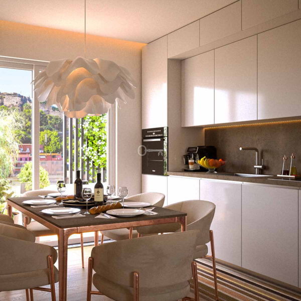 On the promontory is the historic center, fortified by an impressive castle. A few minutes walk from the historic center is the “Sea View” residential complex, very close to the beach and with an amazing view of the castle. The magnificent view also of the sea and the strategic location close to the beach and the main services guarantee a very high comfort of living.
