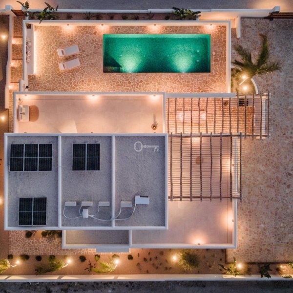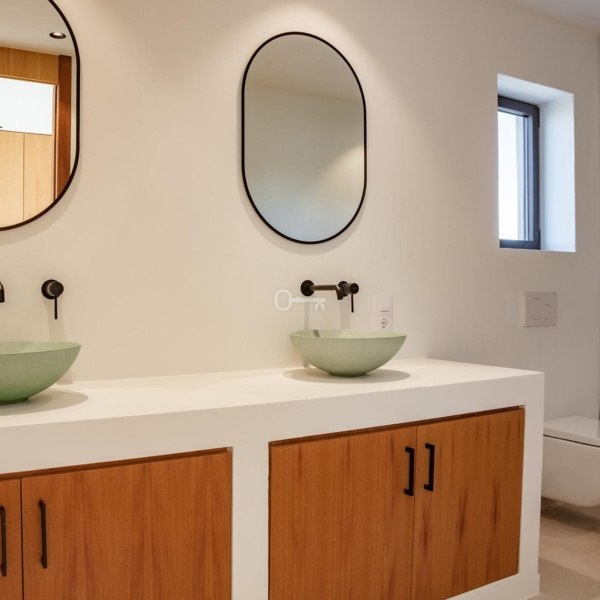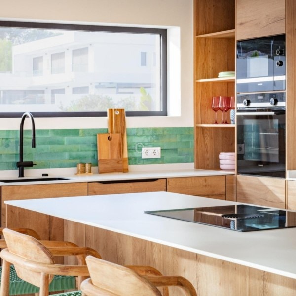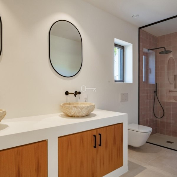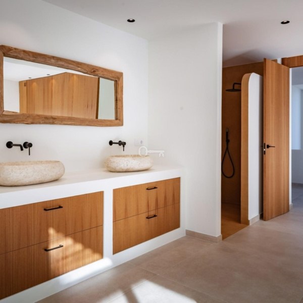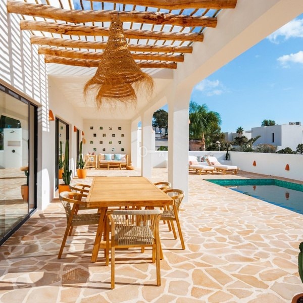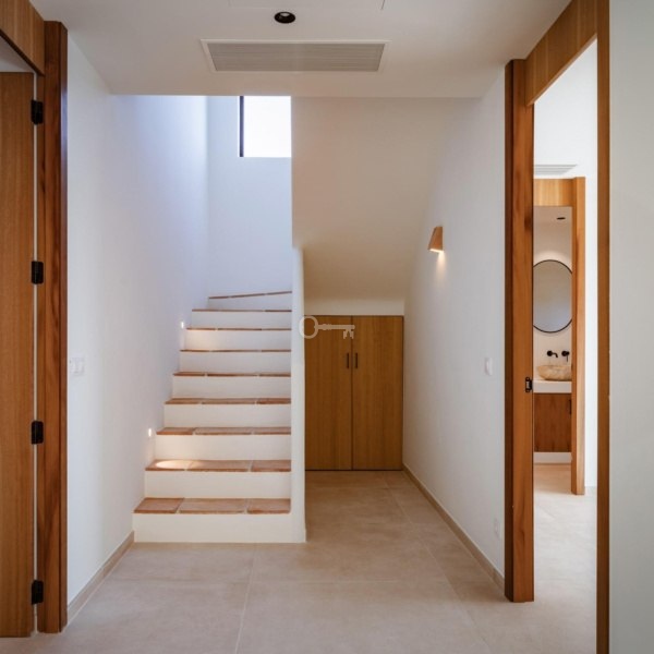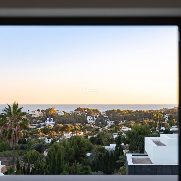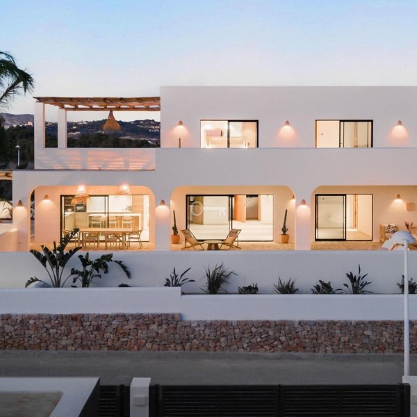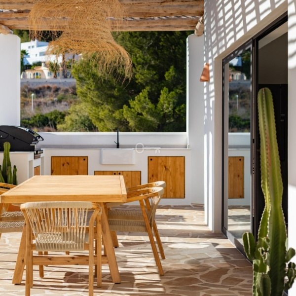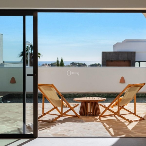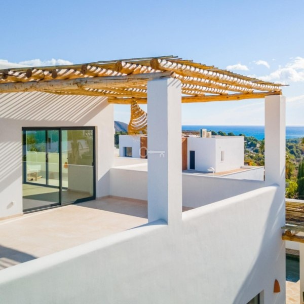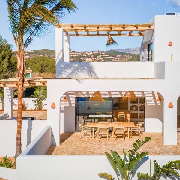 Discover a ready-to-occupy Ibiza-style villa in Moraira with spacious rooms and sea views. On the ground floor you will find a large living room with kitchen, pool terrace, large bedroom and guest toilet. Upstairs there are two bedrooms with balconies. The pool terrace includes a summer kitchen. The villa offers underfloor heating, air conditioning, solar system, parking space and garden. It is the ideal place to live, providing comfort and functionality all year round.