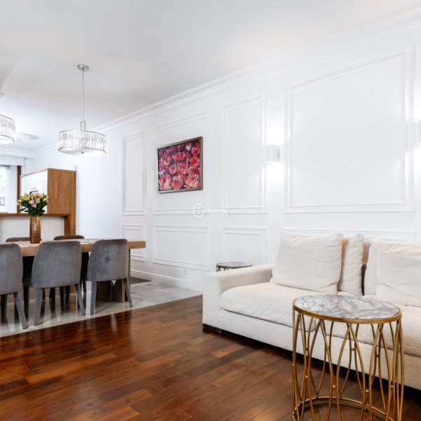 ELEGANT APARTMENT WITH A VIEW OF GREENERY IN THE HEART OF WILANÓW View of trees and complete privacy | 2 loggias | Panoramic floor-to-ceiling windows | Height 3 m | Low-rise building | Ideal for a family of 2+2 ***** ROOM LAYOUT: The apartment comprises:* Spacious living room with kitchen…