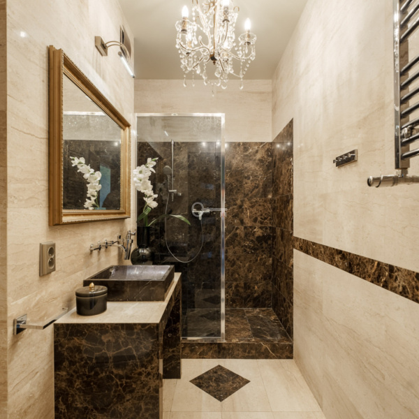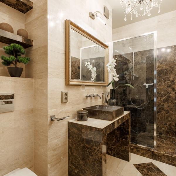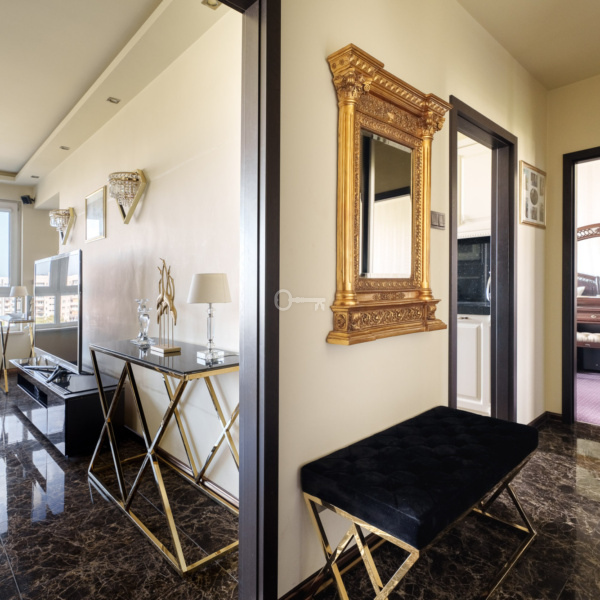 The apartment is well lit thanks to panoramic windows. Spacious kitchen with high-end appliances, and the living room combines dining and lounge areas. Bathroom with large shower and storage space. Interiors in gold and gray colors, with elegant lighting and spacious closets in every room.