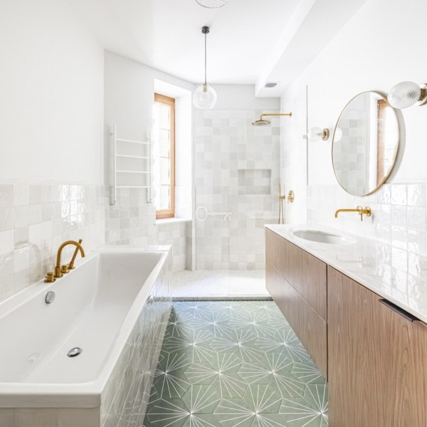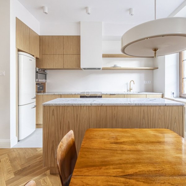 The apartment is finished with attention to every detail, combining elegance with functionality. Granite countertops in the kitchen provide durability and timeless style, while stone finishes and underfloor heating in the bathroom add to the comfort. Classic herringbone parquet floors and large, south-facing windows make the interior bright and airy.