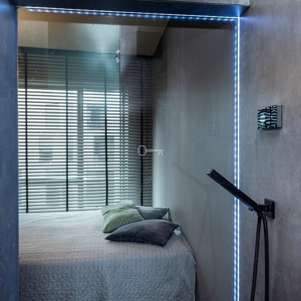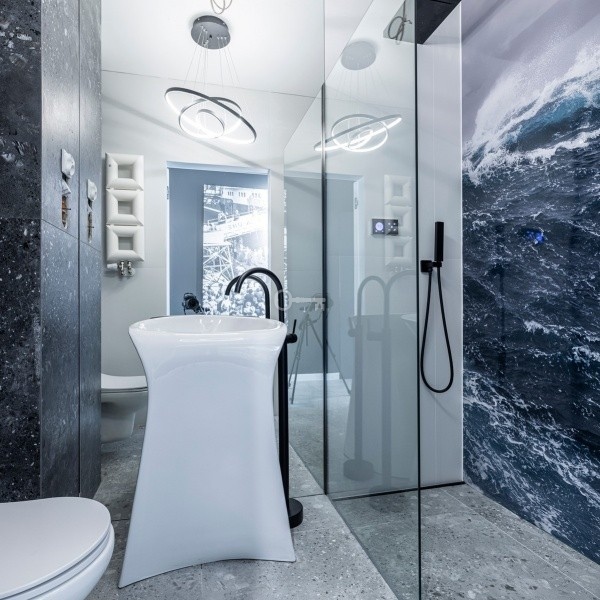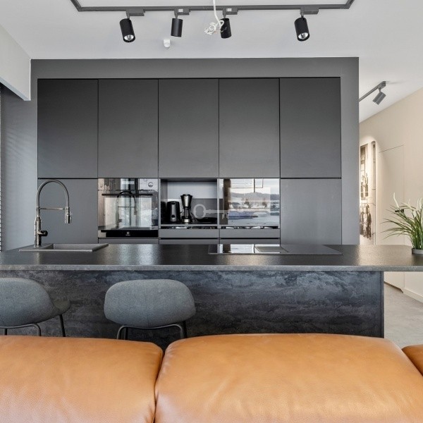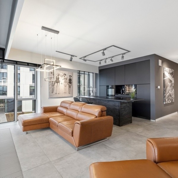 has fully equipped kitchen with a large granite island – made of Granite Absolut Black. Large-format floor tiles (2.8m x 1.2m), tiles in the bedrooms are imitating oak, arranged in a herringbone pattern. In the bathrooms, high-end equipment. Tres shower faucets with electronic touch panels. Floor heating in the entire apartment with trench heaters as an alternative heating system.