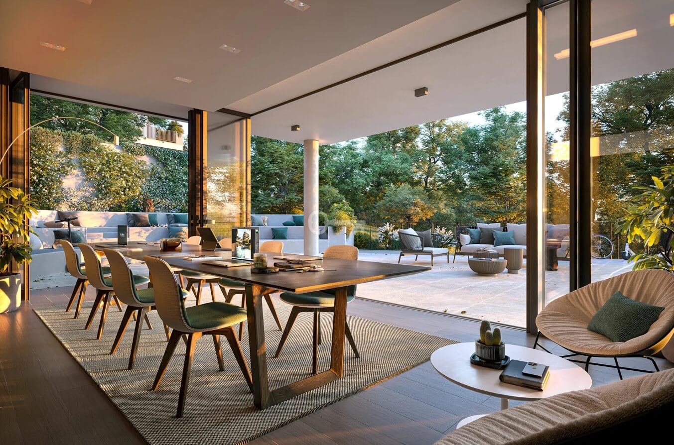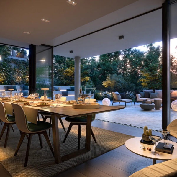 The development offers apartments of various sizes, ranging from one-bedroom units to spacious duplex apartments, each with a terrace or private garden.