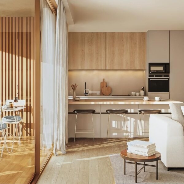 Open-plan kitchen and living room (42.6 m²), with direct access to the private balcony and garden