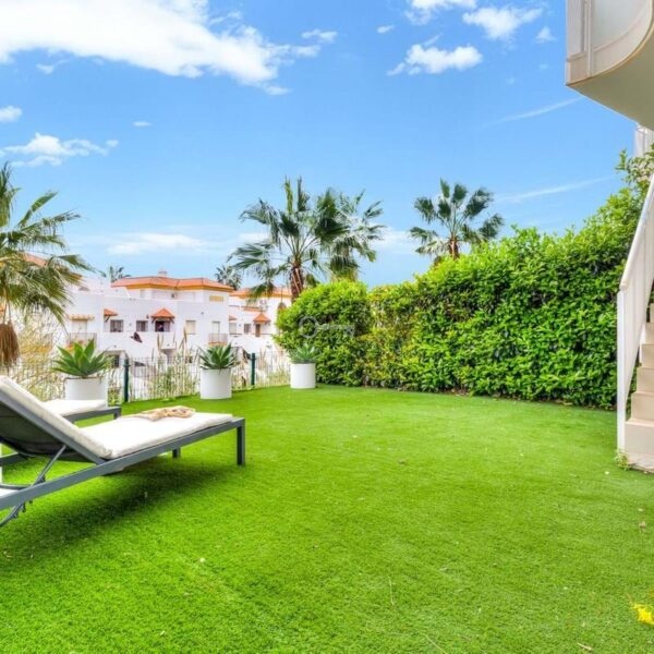One of the most attractive features of this apartment is the spacious terrace together with a private garden with grass. This outdoor area adds an extra dimension to the home and provides plenty of space to enjoy the sun and the pleasant climate throughout the year. Since the apartment is built on a terraced level, the terrace and garden are elevated above ground level, giving plenty of privacy. The terrace is divided into a comfortable lounge area with a large sofa and a dining area with a table, perfect for sunny mornings and long evenings outdoors. The private lawn gives the home a sense of openness while still offering privacy.