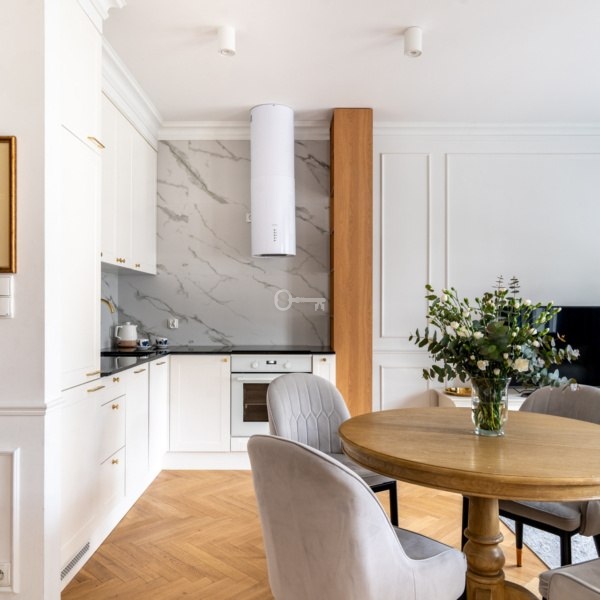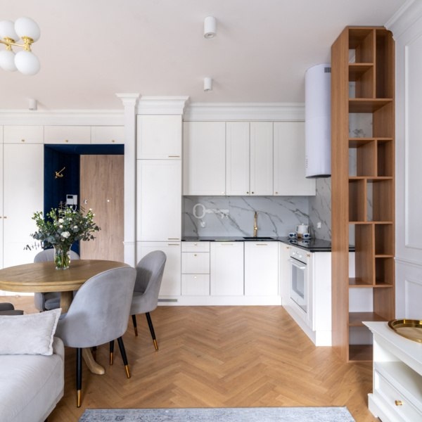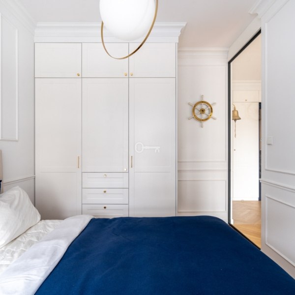 The apartment is finished with high-quality materials, with wooden shutters on the windows and wooden parquet floors. All built-in furniture was custom-made by a carpenter.