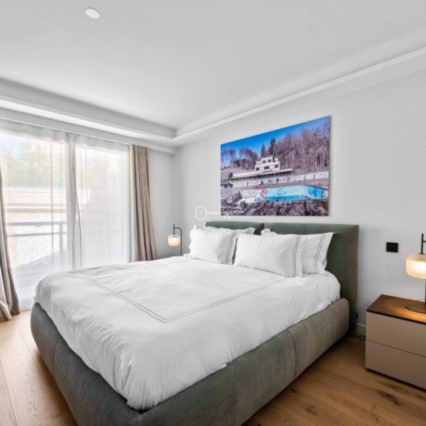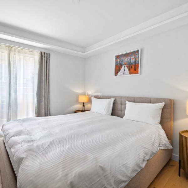 The interiors are bright and airy, ideal for both everyday living and entertaining. The master bedroom features a private balcony, while large windows throughout the apartment allow natural light to highlight the elegant wooden flooring.