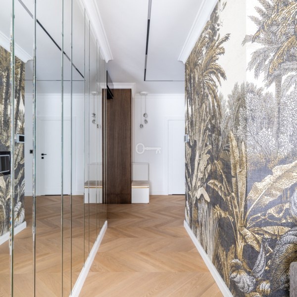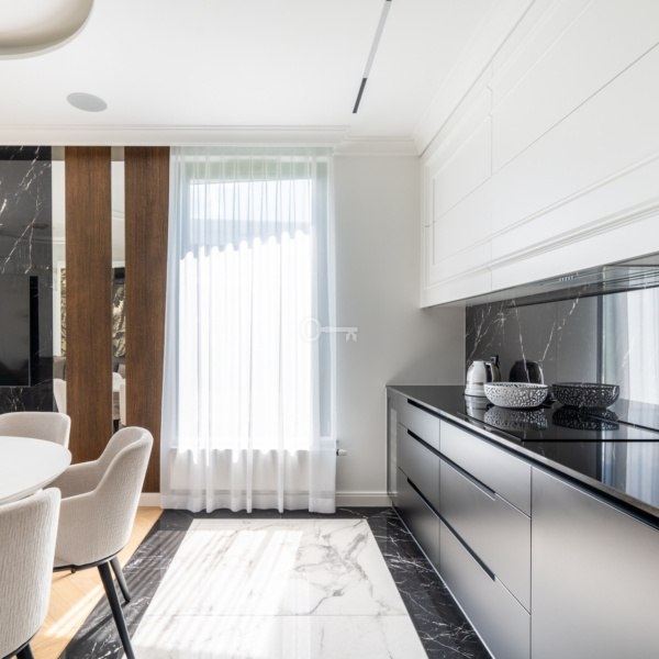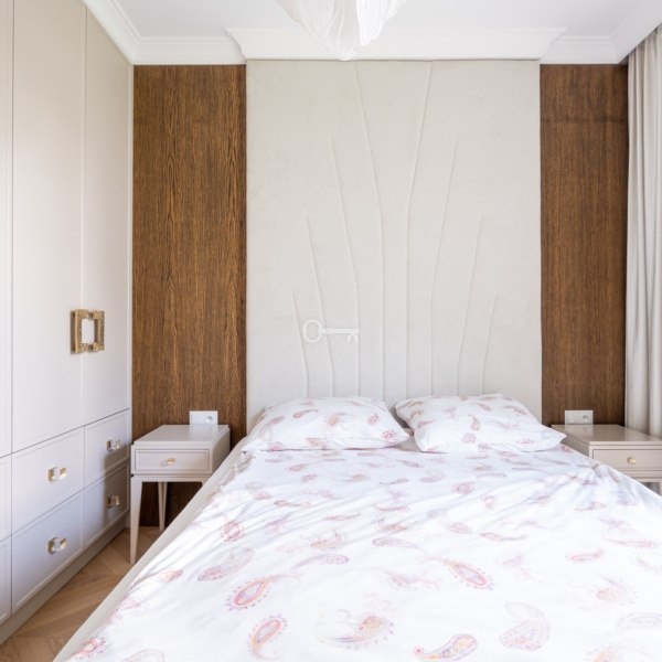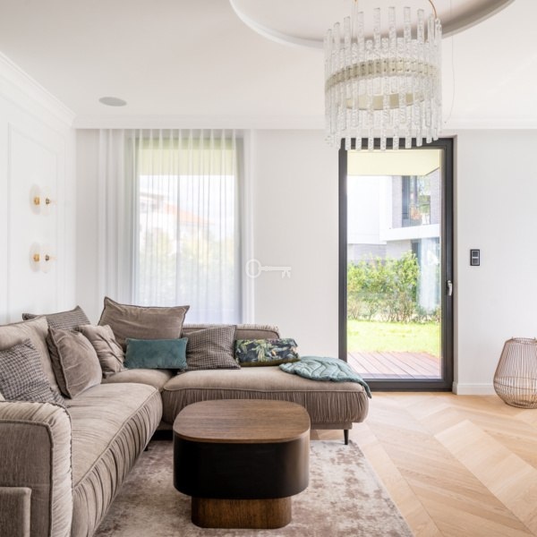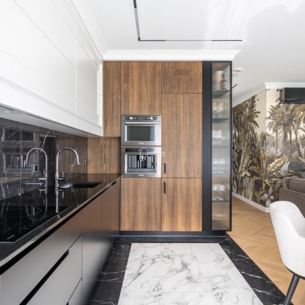 The apartment has been arranged to include two bedrooms. During the design phase, the living room was combined with the kitchen, creating an important sense of spaciousness. The living room provides access to a terrace with a garden. Additionally, space has been allocated for a laundry room in the apartment.