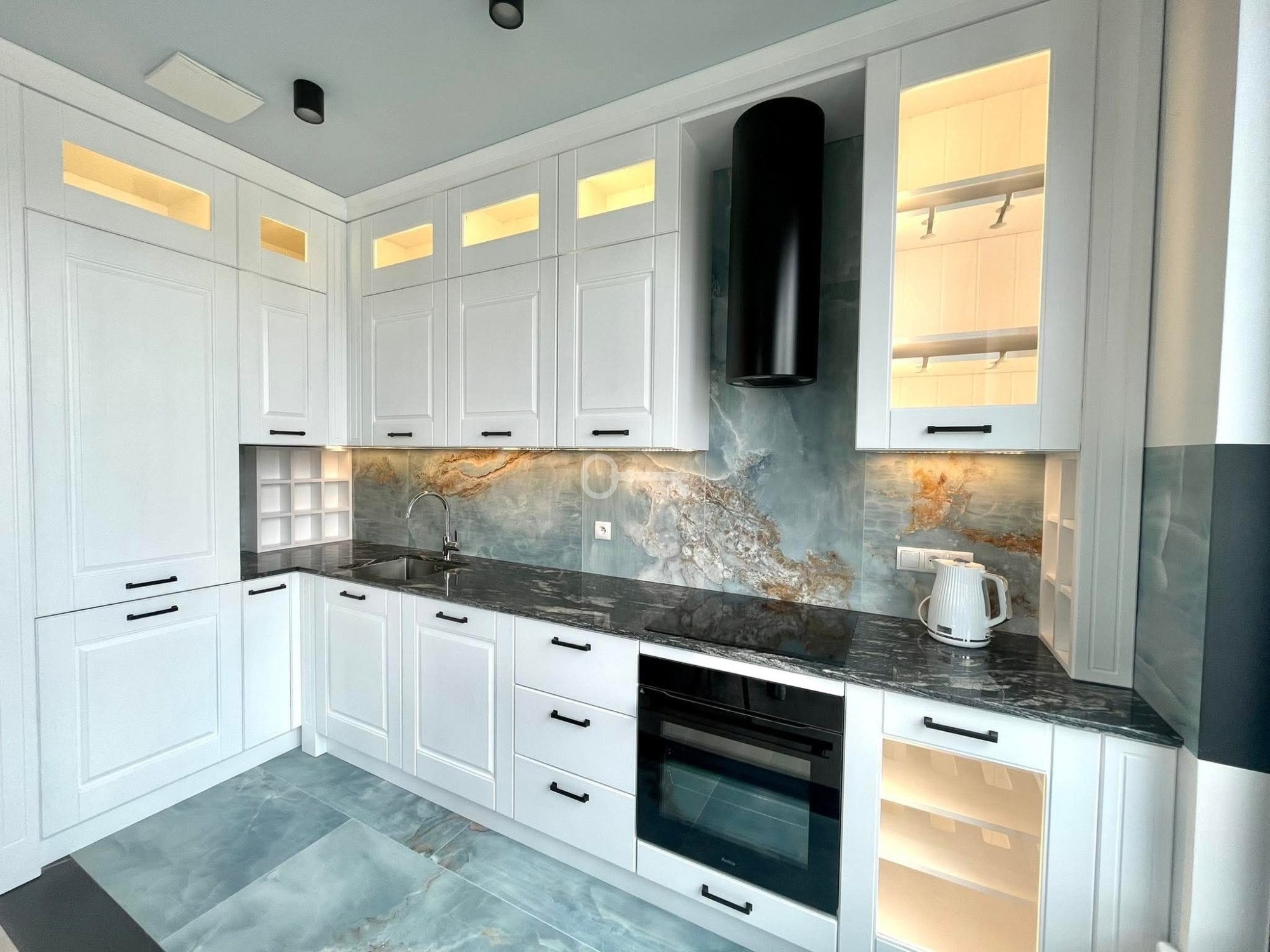 * The kitchen is fully fitted and equipped with appliances, and finished with elegant materials in a consistent color scheme.