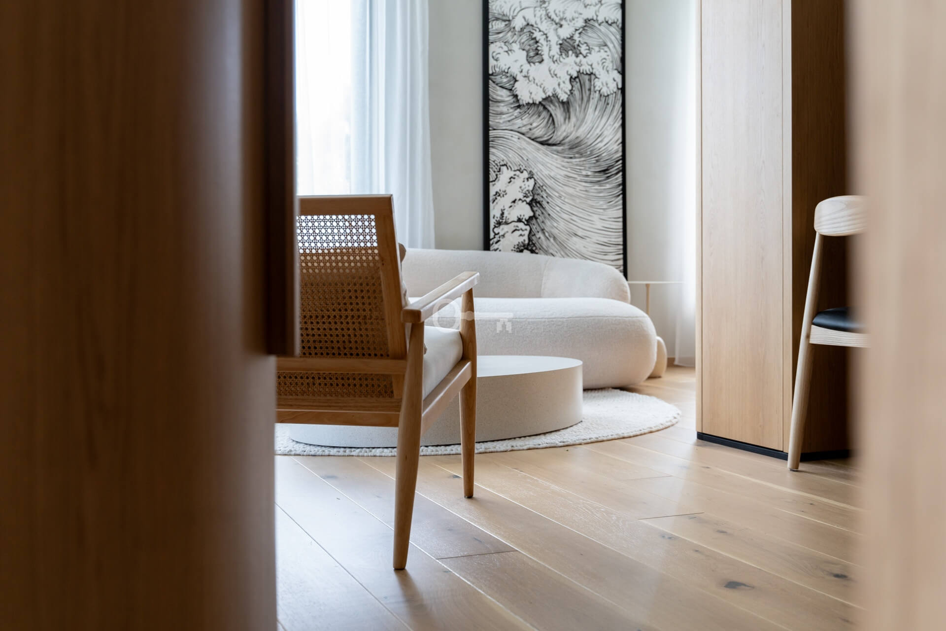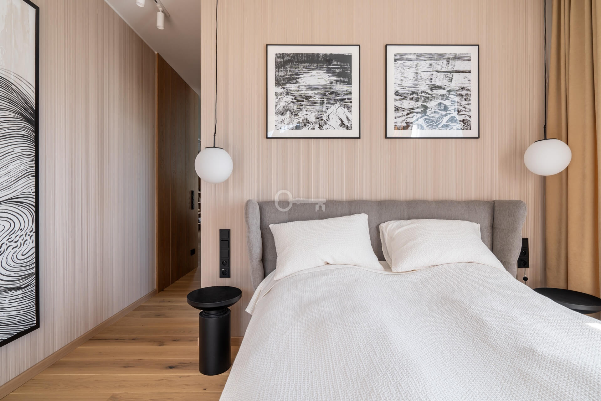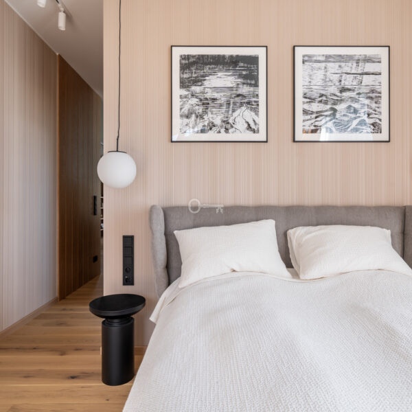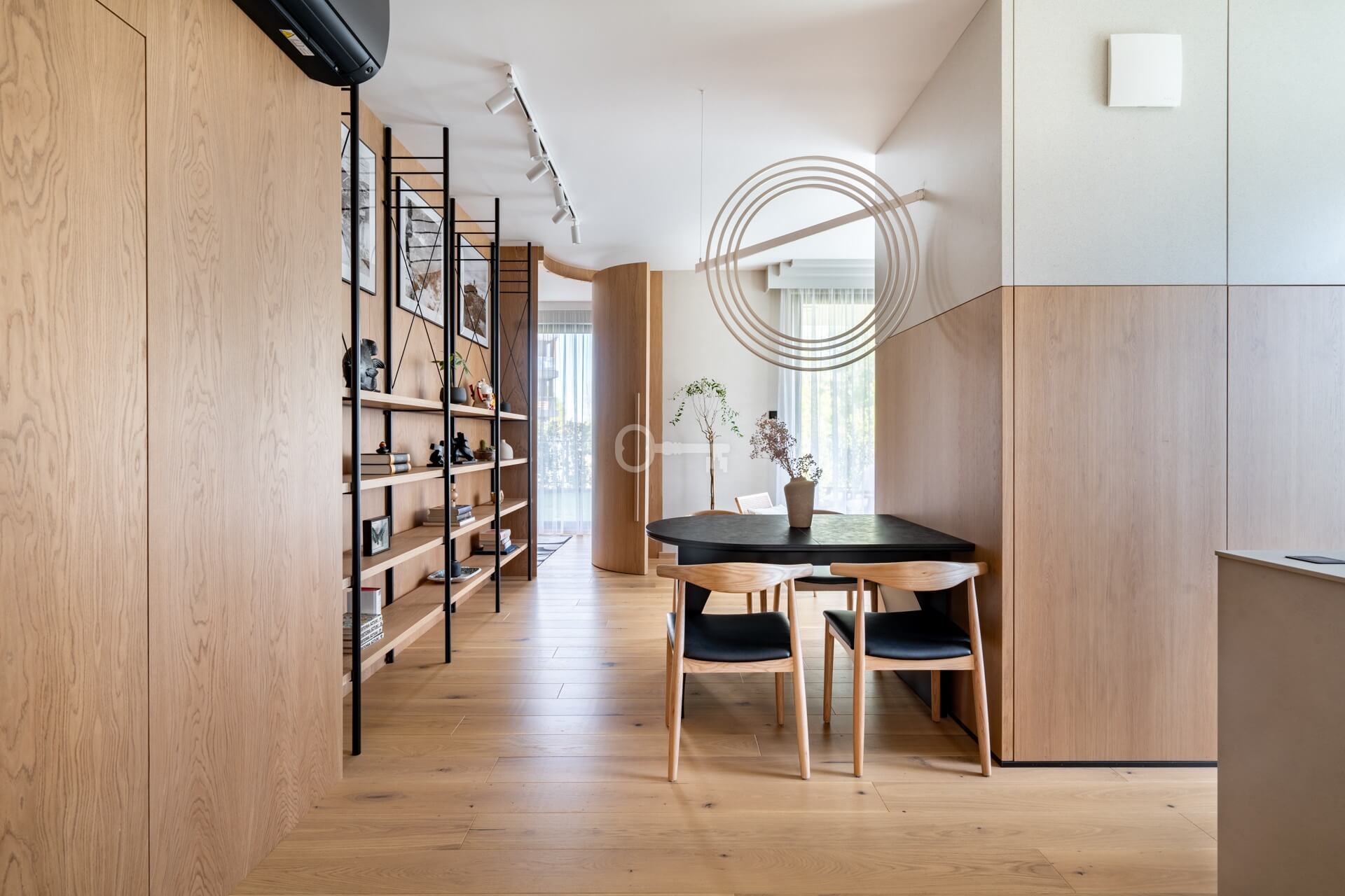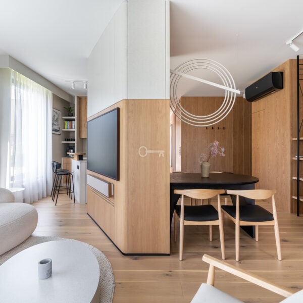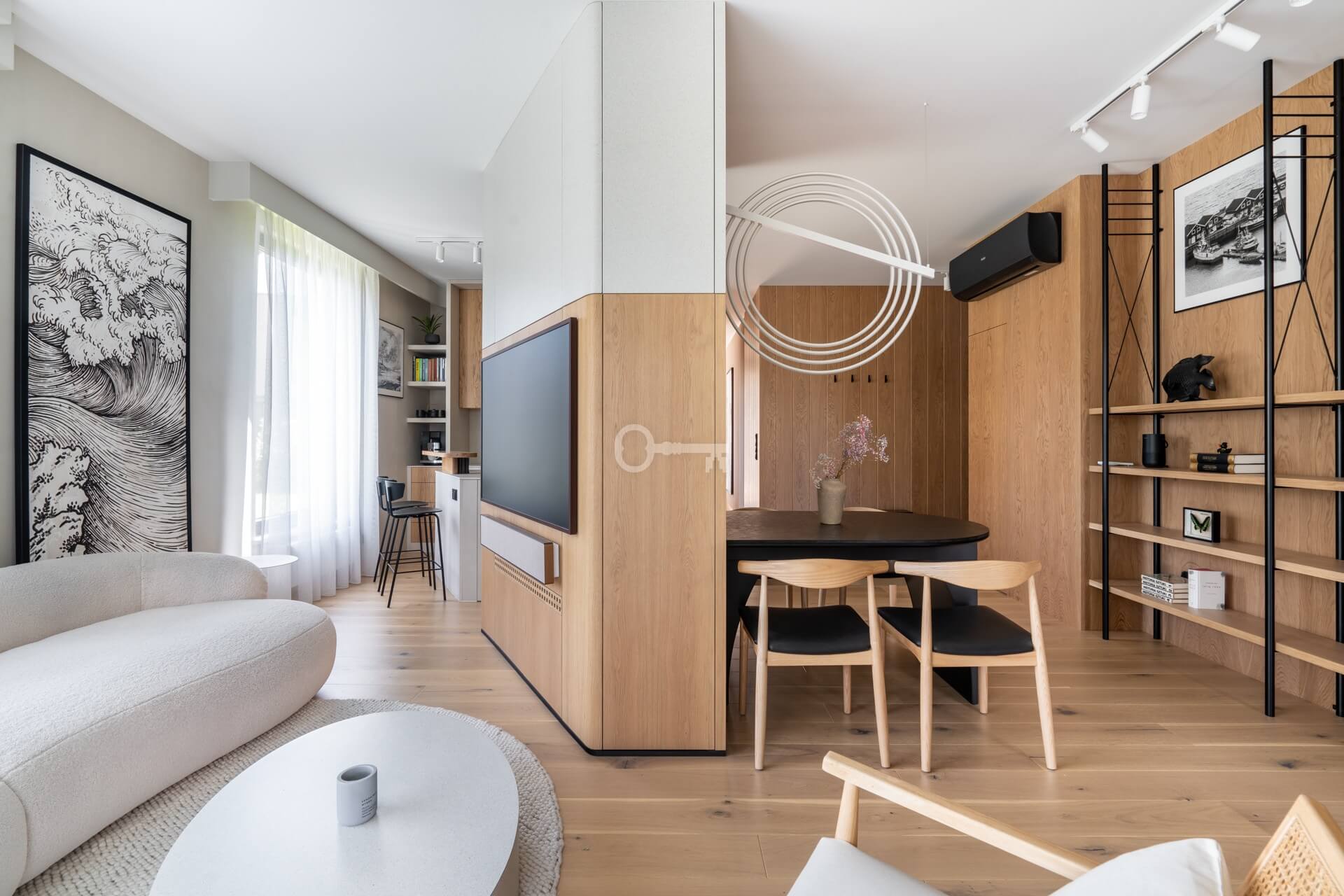 The apartment is finished with the highest quality materials in the Japandi style. Natural wood, stone, and linen dominate the design. Walls in subdued tones highlight the minimalist character of the interior. LED lighting creates a warm and cozy atmosphere. Furniture was custom-made to fit the space perfectly.