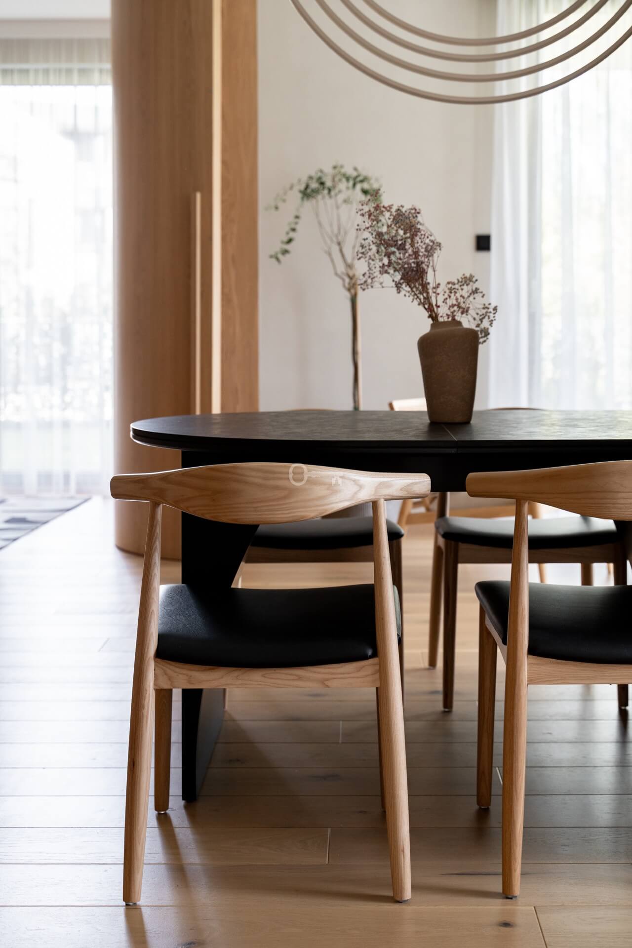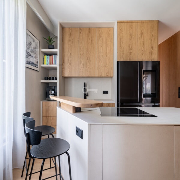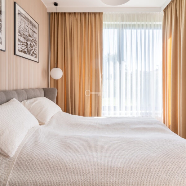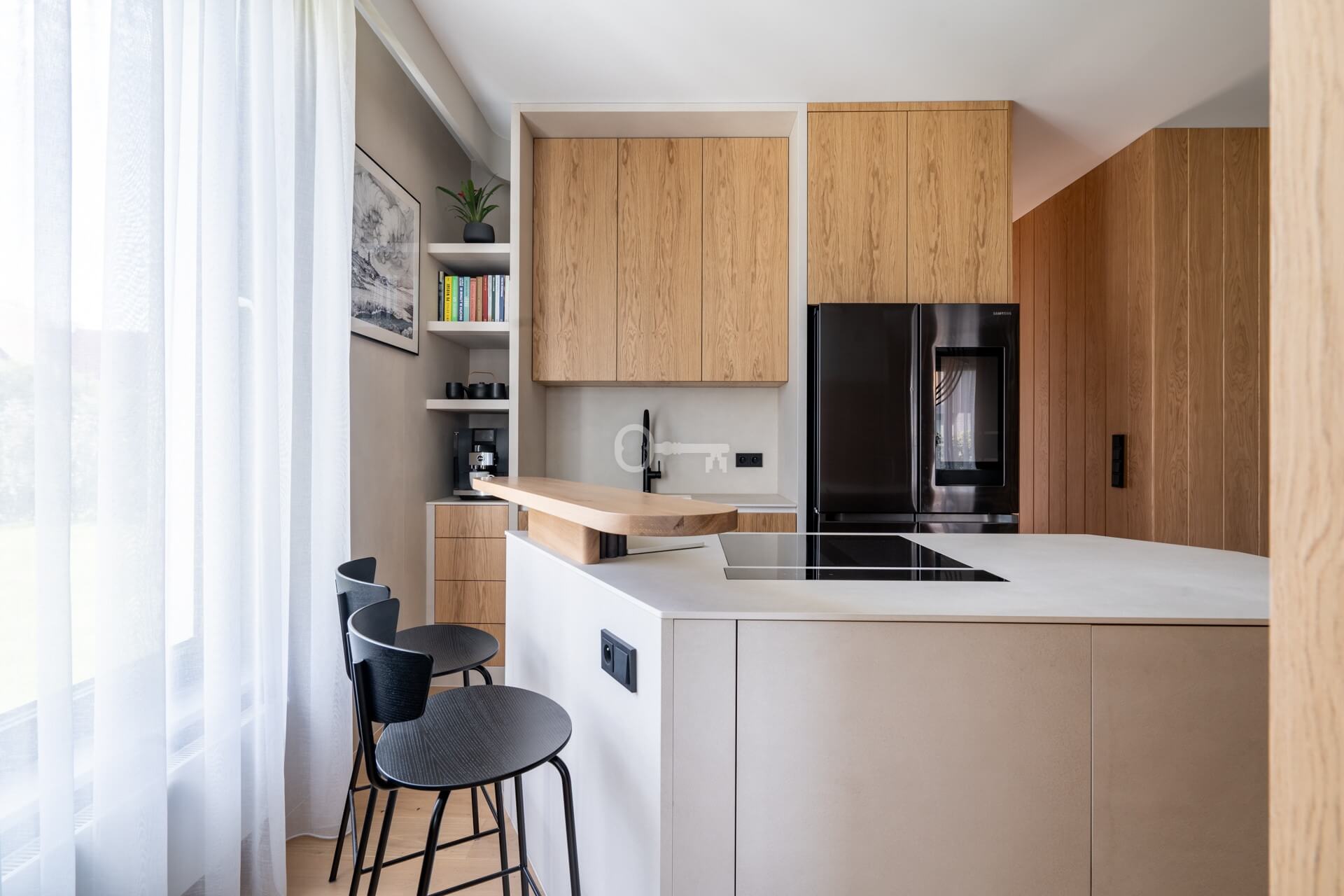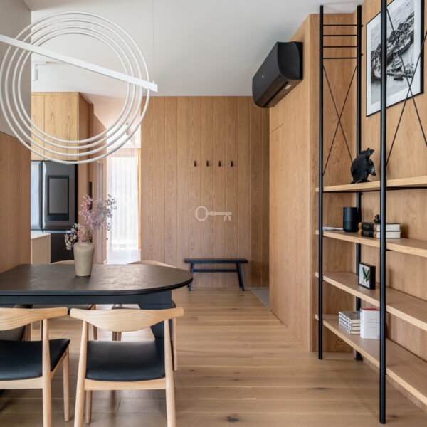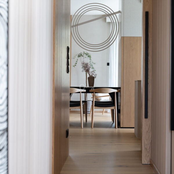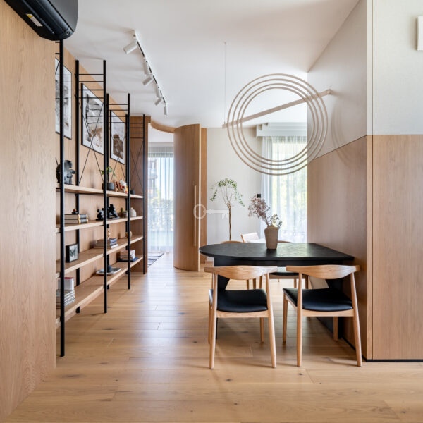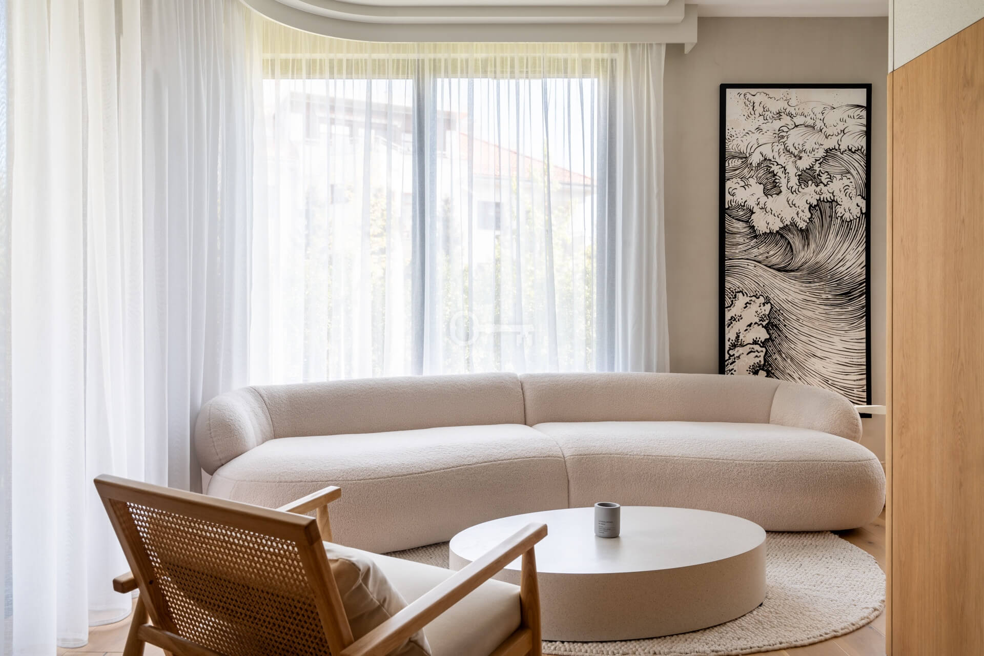 The apartment is finished with the highest quality materials in the Japandi style. Natural wood, stone, and linen dominate the design. Walls in subdued tones highlight the minimalist character of the interior. LED lighting creates a warm and cozy atmosphere. Furniture was custom-made to fit the space perfectly.
