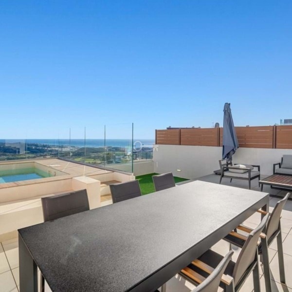 As you move forward, you will find a modern, fully equipped kitchen, which has an elegant grand island that separates it from the bright living-dining room. From here, you can delight in stunning sea views while you enjoy your meals or simply relax. But that’s not all, from the bright open plan living room you have access to a spectacular private terrace which includes a swimming pool – imagine the fun and relaxing moments you can enjoy here.