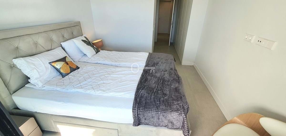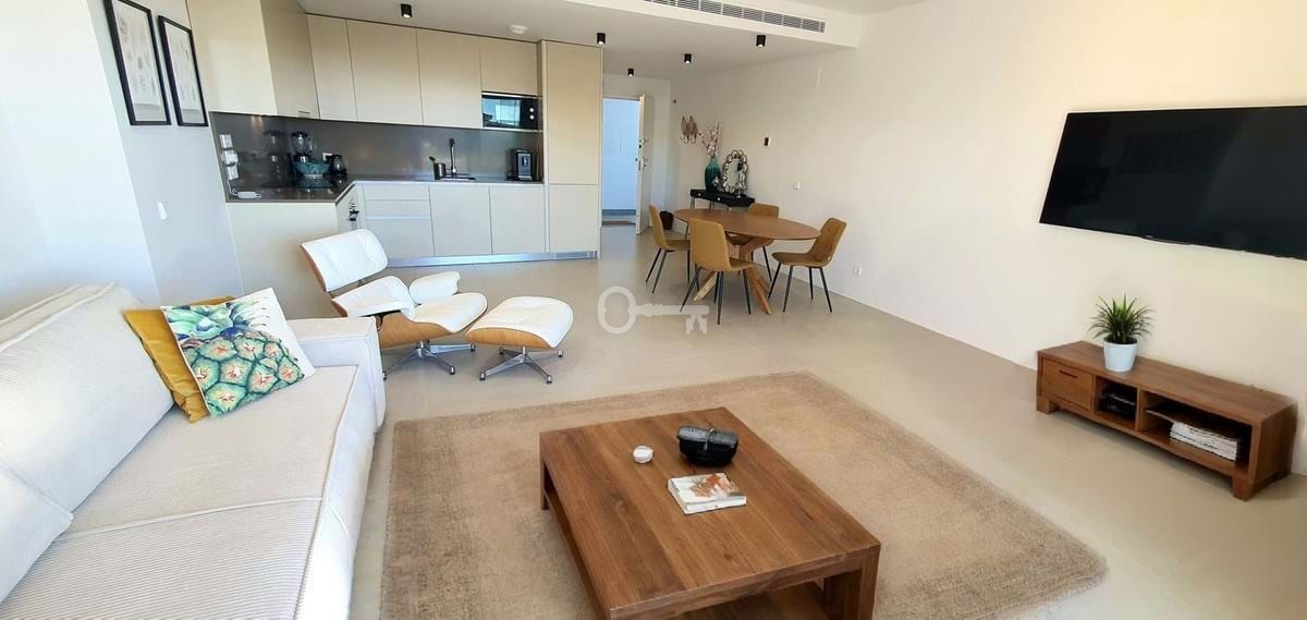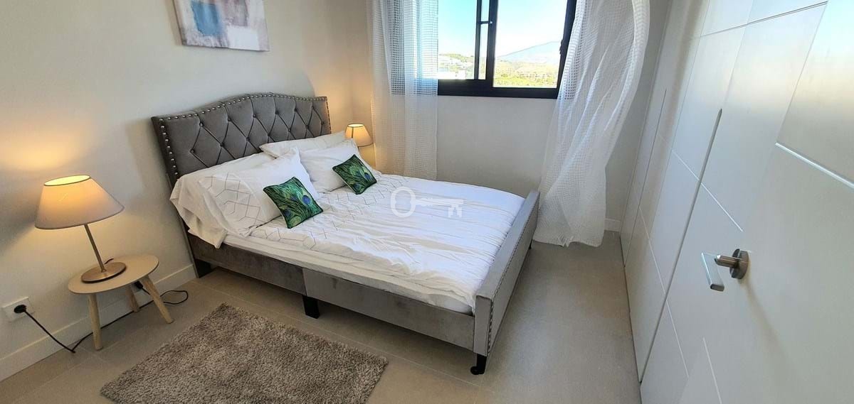 The principal bedroom also enjoys sea views, ample wardrobe space, and a stylish en-suite bathroom. Two additional bright and well-sized double bedrooms feature built-in wardrobes and views over the pool, surrounding hills, and golf course. A guest bathroom with a bath/shower completes the accommodation.