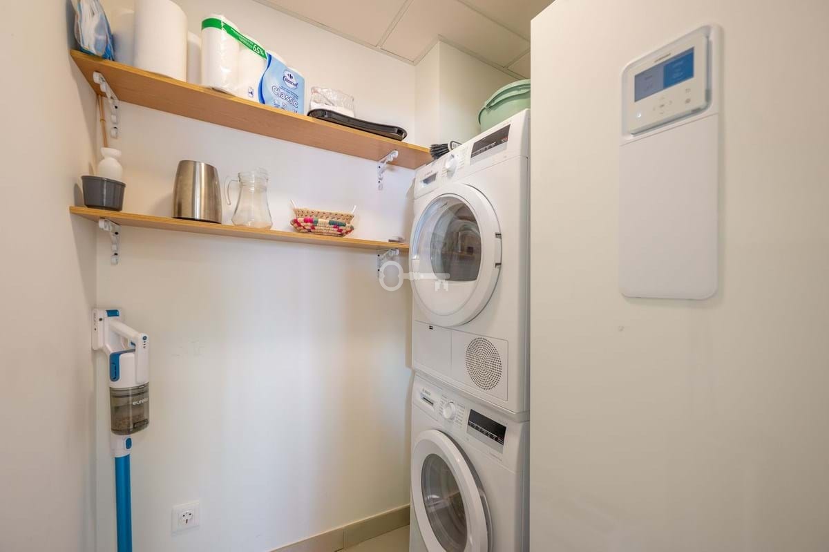 The apartment has two comfortable bedrooms. The master bedroom, measuring over 16 square meters, offers space not only for rest but also a practical walk-in closet. The second bedroom, measuring over 10 meters, works perfectly as a guest room, office, or children’s room. Both bathrooms have been meticulously designed and finished with high-quality materials. An additional asset is a separate laundry room, which helps keep the living areas organized.