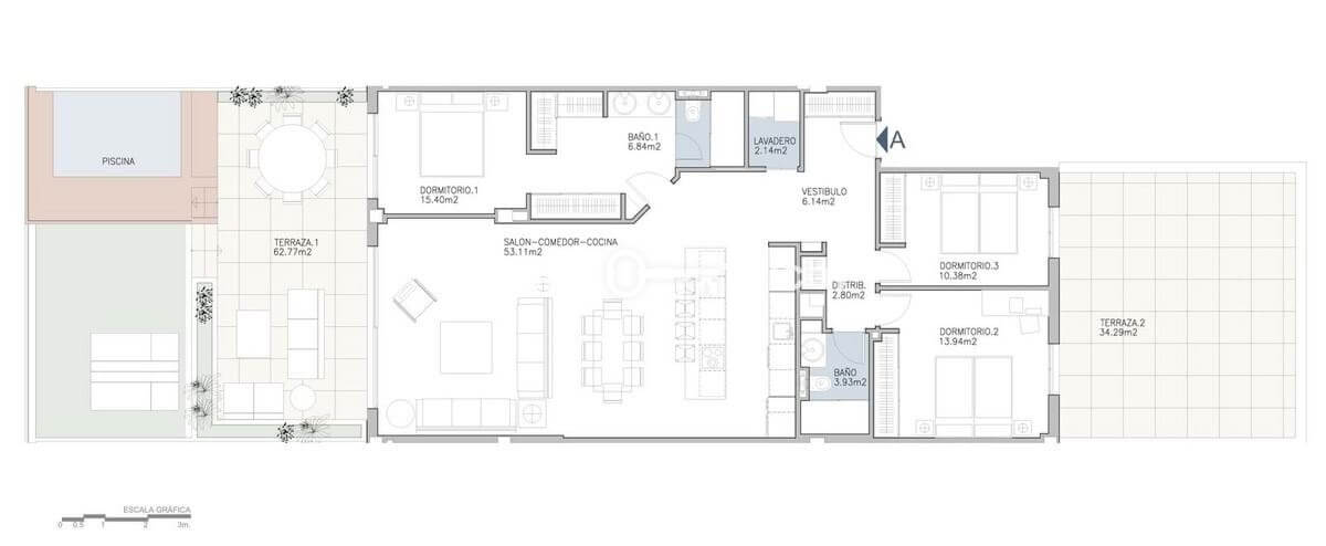 The property itself is an elevated ground-floor apartment featuring three spacious bedrooms, all with fitted wardrobes, and two modern bathrooms. The open-plan living area has been finished to an exceptionally high standard and includes a fully fitted NEFF kitchen, complemented by a separate utility room with space for both a washer and dryer. Comfort is ensured year-round thanks to air conditioning with individual temperature control in each room and underfloor heating throughout the entire apartment.