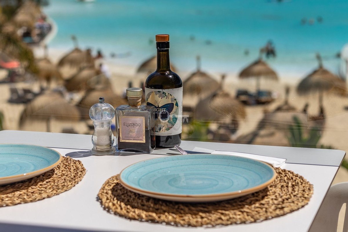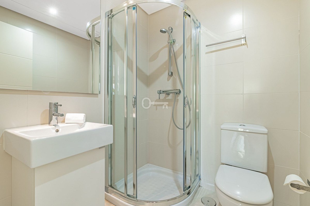 Designed to a high standard of quality and elegance, this flat features ample built-in wardrobes and an efficient hot/cold air conditioning system to ensure year-round comfort. The clever layout includes two bedrooms, one with en-suite bathroom, and an additional guest toilet. The heart of the property is undoubtedly its spacious living room, flooded with natural light thanks to its large glass doors. The kitchen, fully equipped with high quality appliances, offers an ideal environment for the home chef.