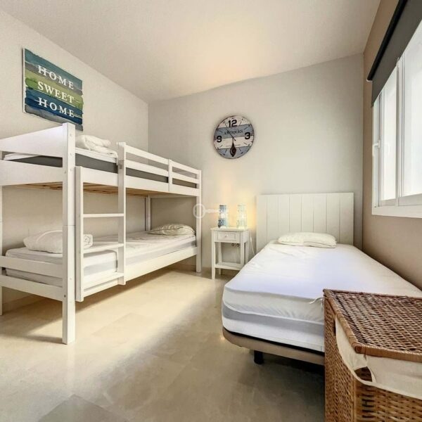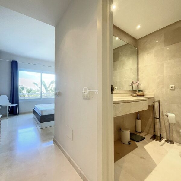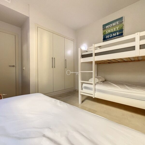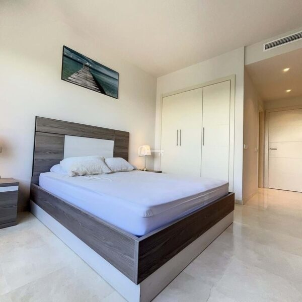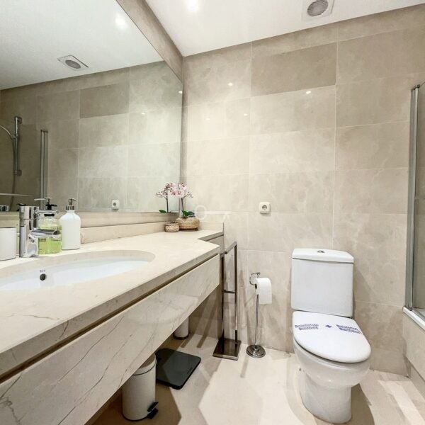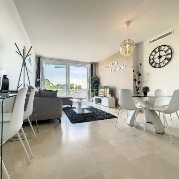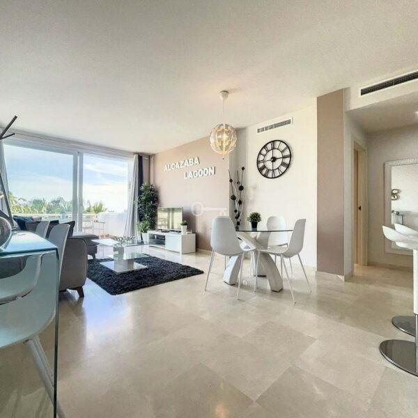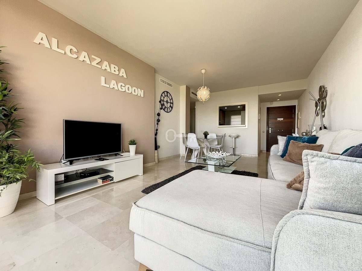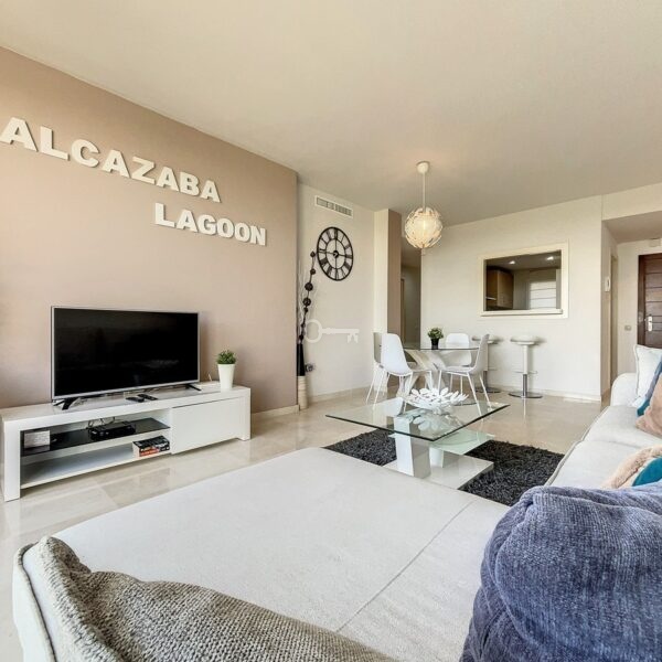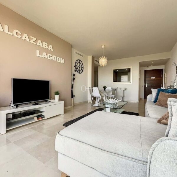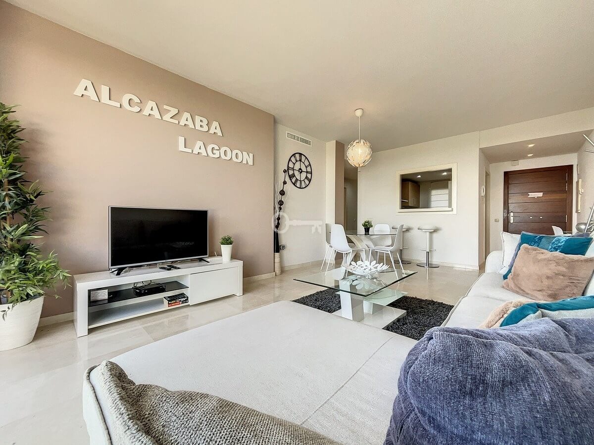 Apartment for sale in Alcazaba Lagoon, Casares with 2 bedrooms, 2 bathrooms and with orientation south/west, with communal swimming pool and communal garage (1 parking spaces). Regarding property dimensions, it has 87.03 m² built and 12.22 m² terrace. Has the following facilities amenities near, fully furnished, fully fitted kitchen, utility room, marble floors, gym, security entrance, double glazing, telephone, private terrace, living room, separate apartment, country view, mountain view, internet – wi-fi, fitted wardrobes, gated community, lift, garden view, pool view, street view, doorman, close to children playground, close to sea / beach, close to golf, uncovered terrace, balcony, handicap accessible, excellent condition, ceiling cooling system, ceiling heating system, saltwater swimming pool, close to shops, close to schools, surveillance cameras, pets allowed and internet – fibre optic.