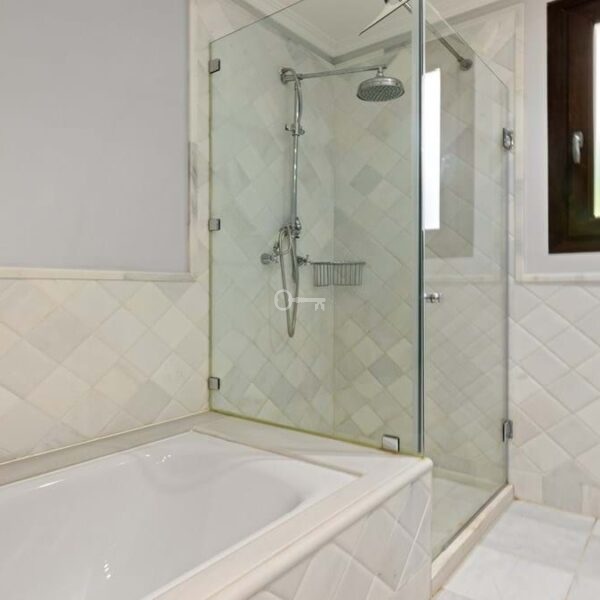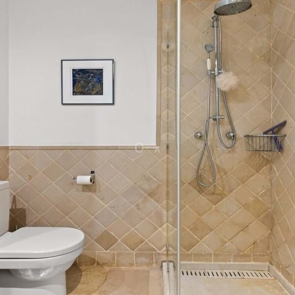 The modern fully fitted kitchen is complemented by a separate utility room, while both bathrooms are finished in neutral marble tones and benefit from underfloor heating, a bath, and walk-in showers. The master bedroom offers direct access to the terrace, creating a serene retreat, while the second bedroom also opens onto the terrace and garden. The third bedroom is versatile, ideal as a guest room, childrens room, or home office.