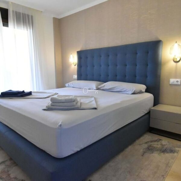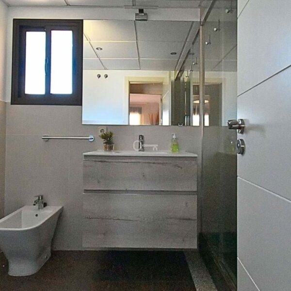 The generously sized living room is perfect for year-round living and opens directly onto a pleasant covered terrace. The property offers two double bedrooms with ample wardrobes and centralized air conditioning throughout. The master bedroom has access to the terrace and includes an en-suite bathroom with double sink and bathtub, while the second bathroom, independent, features a shower.