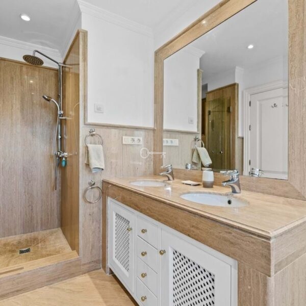 The property has three double ensuite bedrooms, including the master suite with a large private bathroom featuring a corner jacuzzi bath, walk-in shower, and double basins. Each bedroom has direct access to the extensive terrace. There is also a separate guest toilet. Air-conditioning is installed throughout, with underfloor heating in the bathrooms.