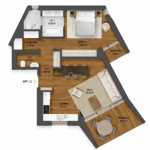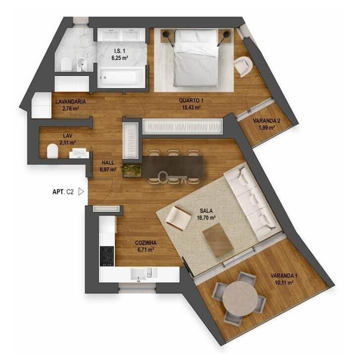 The apartment has a gross private area of 72.58 m2 and faces south, with fantastic sea views, providing plenty of light in every room.