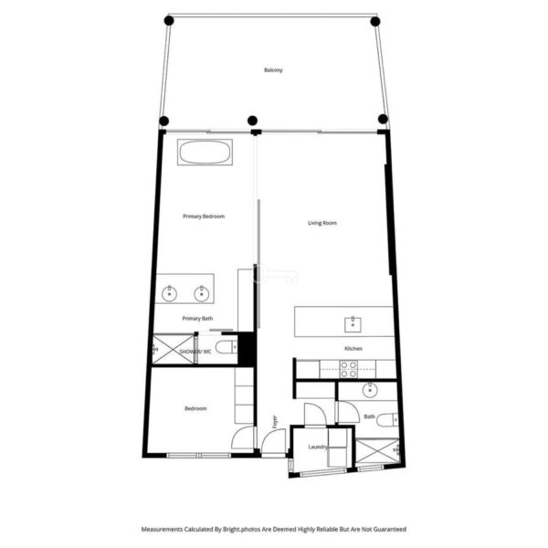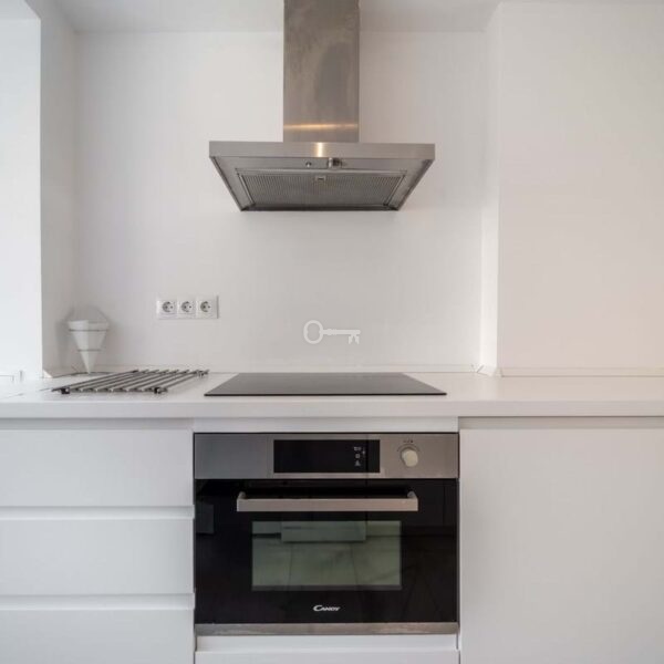 The apartment has a built area of 107 m² and feels remarkably spacious and bright. The living area is fully open, with no walls separating the living room and kitchen, allowing natural light to flow through the apartment from both sides. The open layout and the sightline from the terrace through to the kitchen give the apartment a particularly airy and luminous feel. The south-facing terrace connects seamlessly with the living space and offers plenty of room for a dining table.