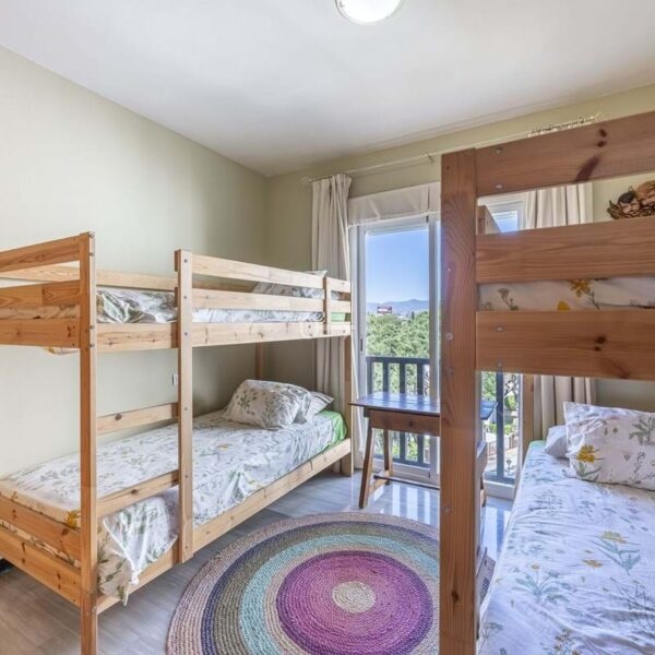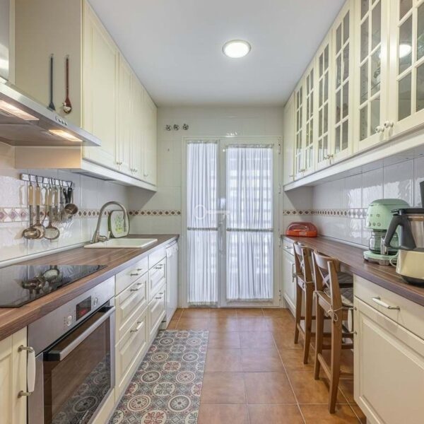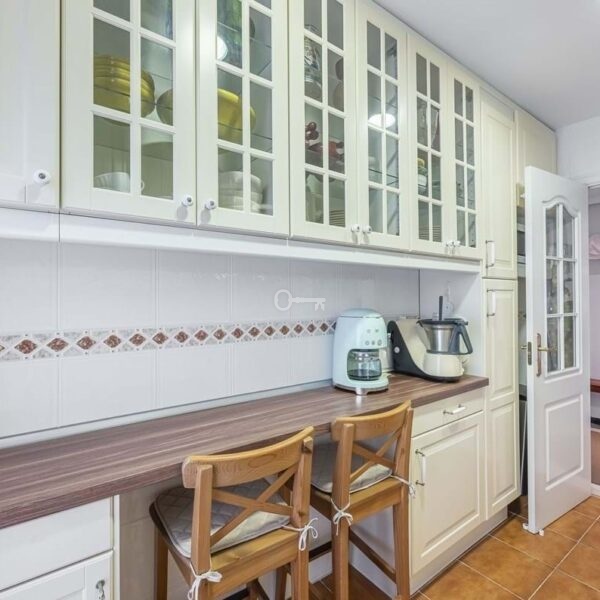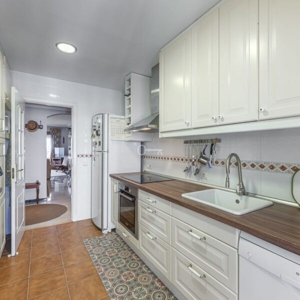 The property features 3 bedrooms with fitted wardrobes, 2 full bathrooms, 3 terraces with beautiful views of the sea and green spaces, and a spacious, fully equipped kitchen with a utility room.