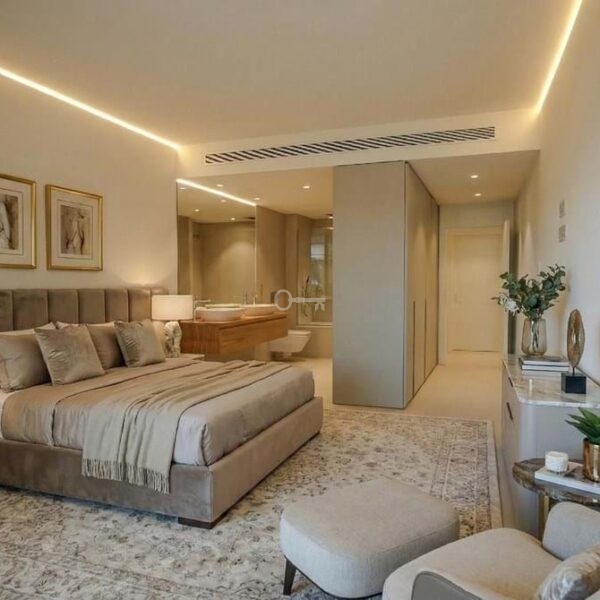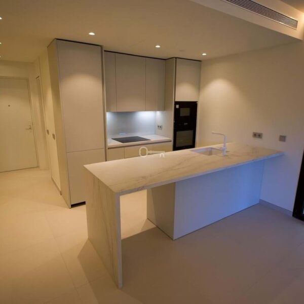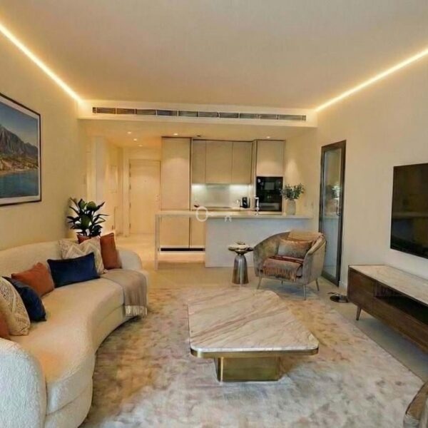 The apartment features 2 spacious bedrooms and 2 modern bathrooms, along with a bright open-plan living area and a fully equipped designer kitchen with high-end appliances.