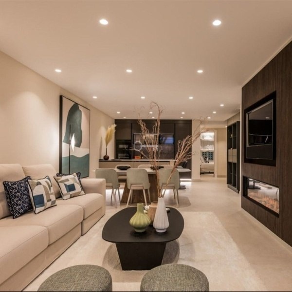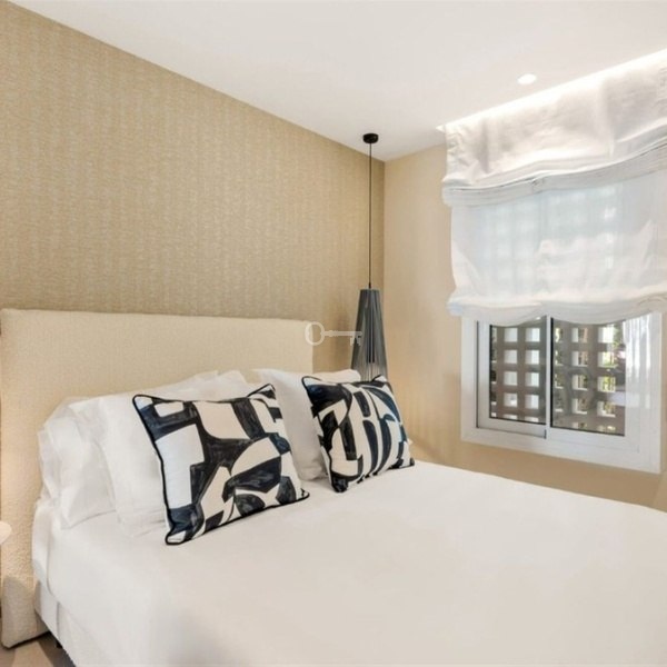 This beautiful south-facing ground floor apartment has 3 bedrooms and 2 bathrooms. It has been completely renovated and is sold in perfect condition. The apartment features an open-plan living area with modern furniture and high-quality finishes, including custom made wardrobes, elegant floors, an electric fireplace, and a Bang & Olufsen sound system. The new designer kitchen is fully equipped with Miele appliances. From the living area, you can go directly to the covered private terrace that offers sea views. The master bedroom has an open-plan bathroom, a walk-in closet, and also opens onto the main terrace. This apartment by the sea is fully furnished and ready to move in. It also includes a private underground parking space and a storage room.
