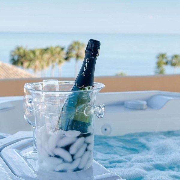 Adjoining the living area, a large semi-covered terrace with built-in BBQ invites you to enjoy outdoor dining with spectacular coastal views. A spiral staircase leads to the expansive rooftop solarium, offering 360-degree vistas stretching from the Marbella and Estepona mountains to Gibraltar and the North African coast. This upper terrace includes a generous jacuzzi, shaded lounge area, and space for sunbathing the ultimate setting for relaxation or entertaining.