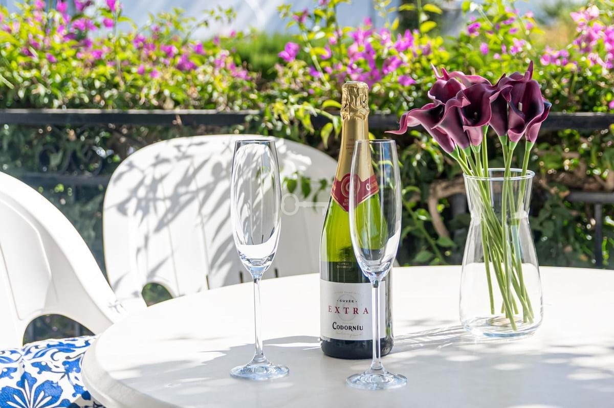 From a spacious Andalucian courtyard with ample storage closets and utilities installed, the entrance leads to a Mayfair mint wood panelled Balay appliance kitchen with opulent green marble surfaces complimented with exquisite detailed wall and floor tiling designed with a convenient open hatch wood panelled doors facing the lounge and the fuchsia bougainvillea filled exterior terrace on front of the gardens. White and light grey marble flooring throughout the living areas, elite specification double insulation thermal windows, integrated mosquito blinds, blackout blinds installed, new Dual Inverter LG Air-conditioning throughout all rooms, new lounge furniture, new beds, upgraded kitchen featuring a dishwasher. Luxuriously styled lounge and dining room offers access to an impressive double aspect dining and relaxation terrace with sun beds and a sunbathing garden area facing the tall tropical palm filled gardens and impressive garden features.