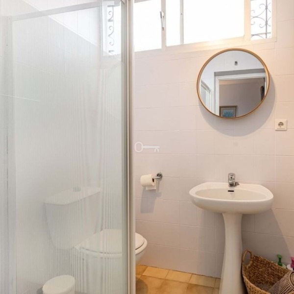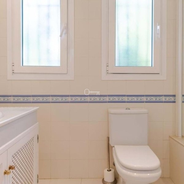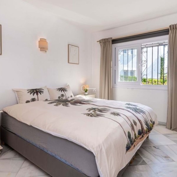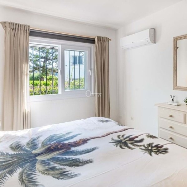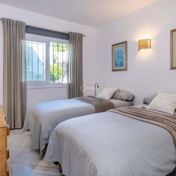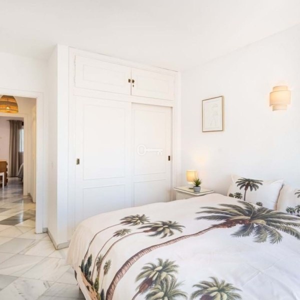 The Master bedroom with a super king bed equipped with double panelled wardrobes and offers views to the tropical gardens – Adjacent luxurious Andalucian master bathroom designed with an immaculate white marble integrated vanity unit with purpose built white carpentry, a porcelain bathtub with shower, double windows and integrated spots to the ceiling. A further guest bedroom with ensuite bathroom offers 2 beds with beautiful garden views.