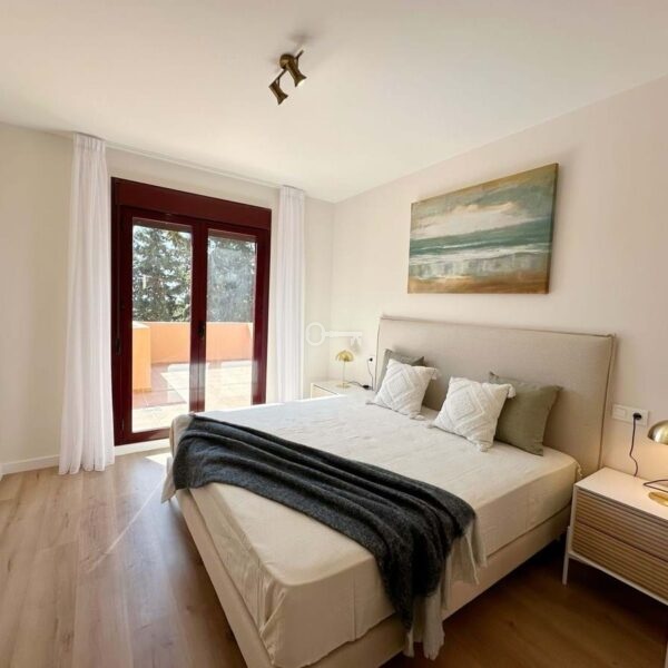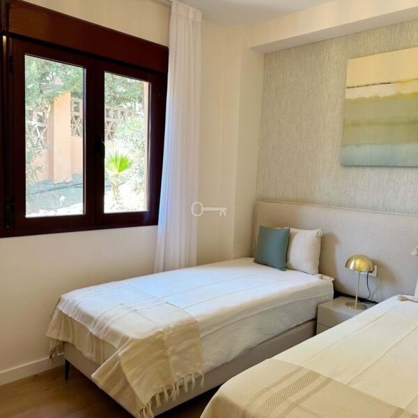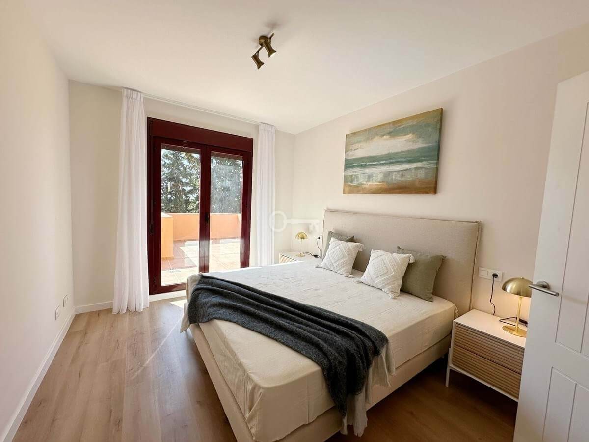 The apartment features three generous bedrooms, each with its own en-suite bathroom, ensuring maximum privacy and convenience. The bright and spacious living area opens onto a serene private terrace, ideal for outdoor dining, relaxation, or enjoying the Mediterranean climate. A fully equipped independent kitchen completes the layout.