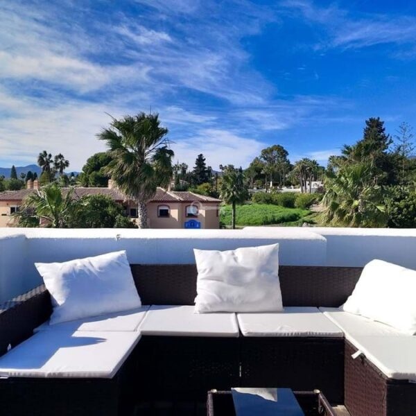 The community includes a swimming pool, and the property is located just 400 meters from the beach, 100 meters from the A7, and only 10 minutes from Puerto Banús.