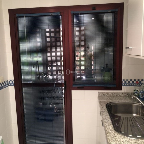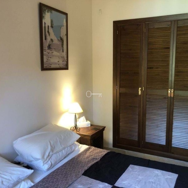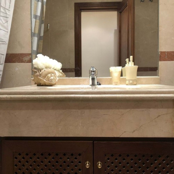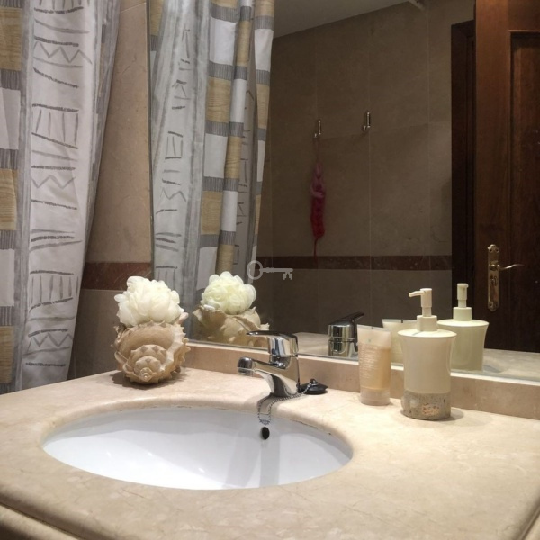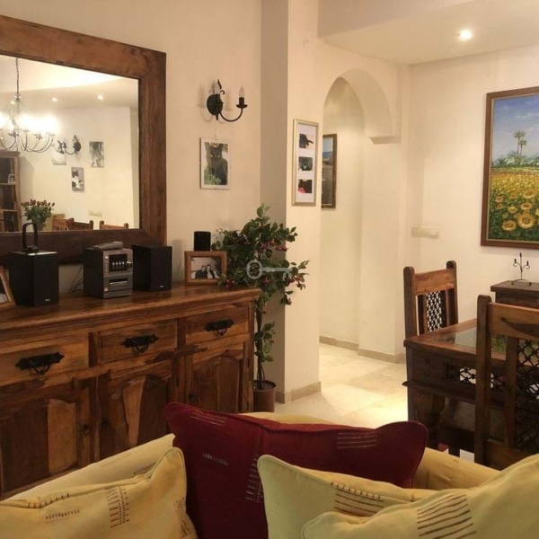 The flat is exceptionally well kept and has 155m2 built and has 3 bedrooms and 2 bathrooms, of which the master bedroom is en-suite. Both bathrooms have underfloor heating. The kitchen is independent and has a separate utility room. Both the living room and the master bedroom lead out onto a partially covered terrace, south-southwest facing, but offering sufficient protection from the sun. The terrace gives direct access to the swimming pool with beautiful mature gardens. One of the other bedrooms also has a terrace (east facing). All bedrooms have very nice built-in wooden wardrobes and the whole flat has marble floors.