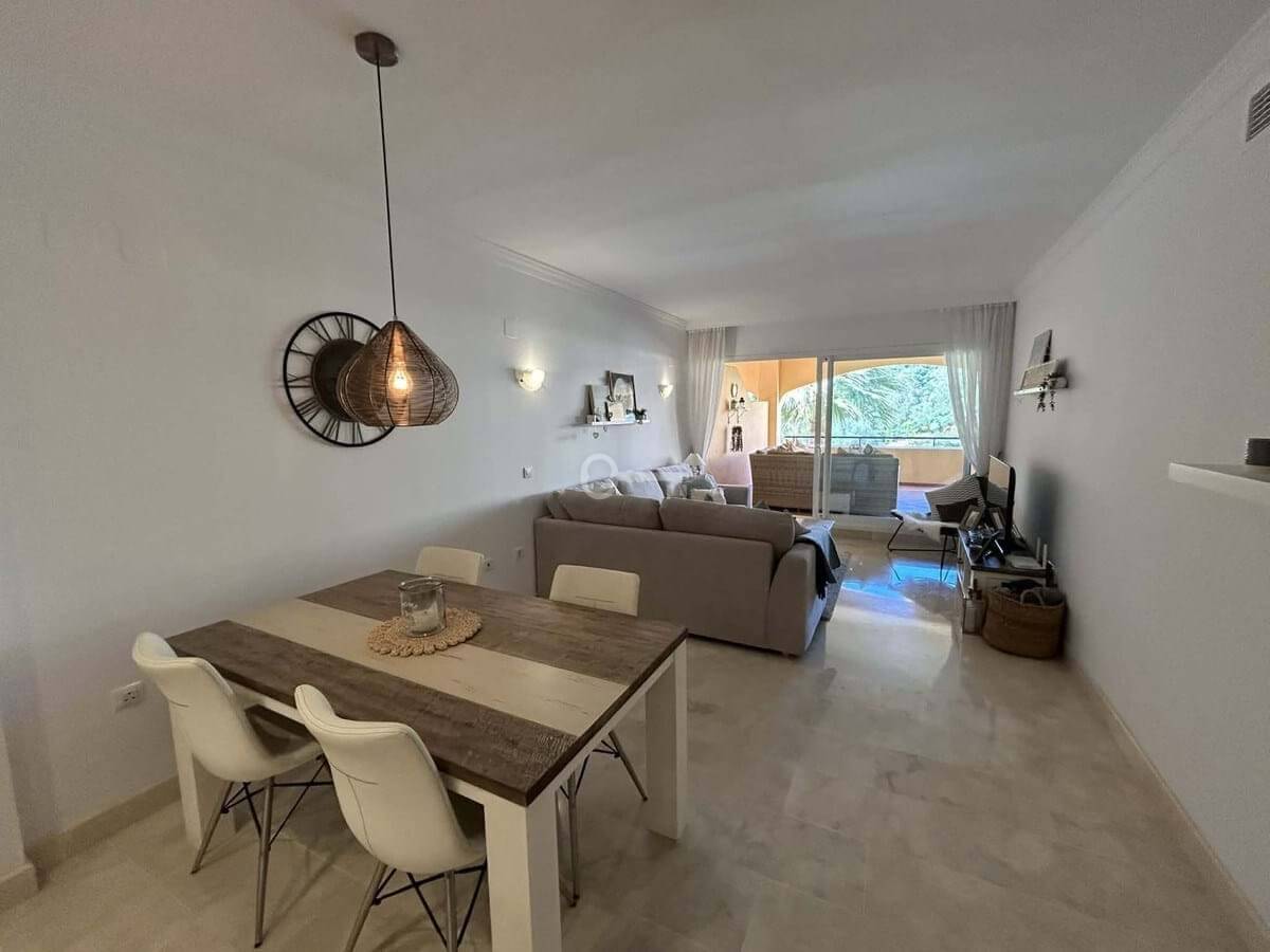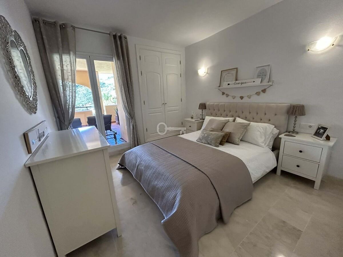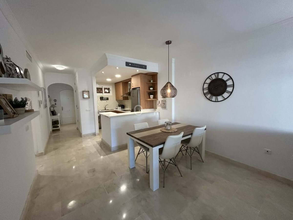 Elegant and bright west facing apartment situated in Santa Maria Village, a gated 24hour security community nested in Elviria, only minutes away from Marbella’s nicest sandy beaches. This immaculate apartment combines comfort, style and convenience and features an ample open plan living & dining room with a modern fully fitted kitchen. From the living room and master bedroom you exit out onto the large covered terrace with views to the pool, communal gardens and surroundings. This is a quiet and well kept community with landscaped gardens, 4 large swimming pools, children’s pools and is just a 5 minute drive from 2 commercial centers with shops, supermarkets, bars, restaurants and other amenities, making it the perfect blend of comfort and accessibility. The property also features A/C hot & cold, laundry room, a private dedicated parking space & storage room. The perfect holiday home or permanent residence for those seeking tranquility without sacrificing amenities and security.