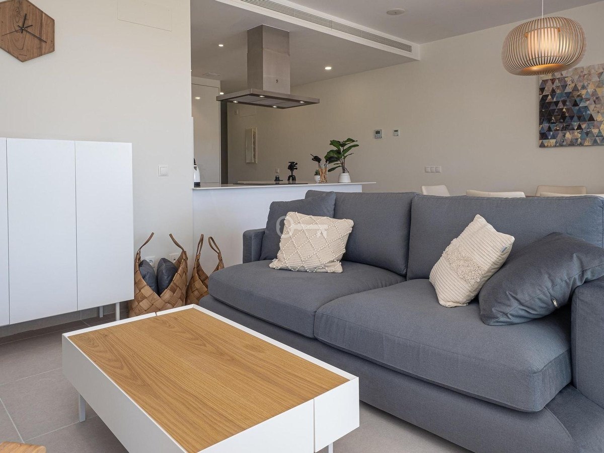 Inside, the apartment is tastefully decorated and fully furnished, featuring high-quality finishes throughout. The open-plan kitchen with a striking central island is fitted with top-quality Siemens A+ appliances. The bright and airy living and dining area flows seamlessly to the terrace and garden through three large sliding doors blending indoor and outdoor living in true Mediterranean style.
