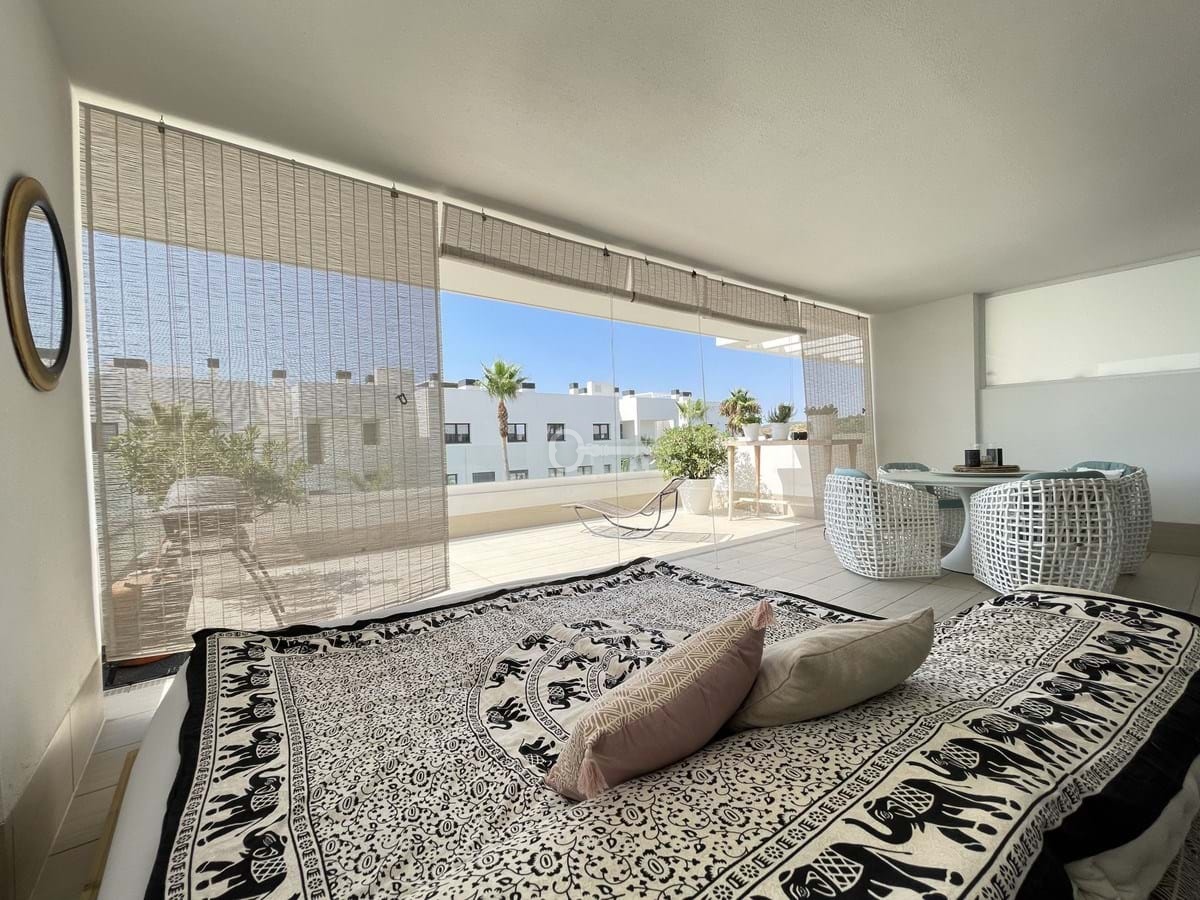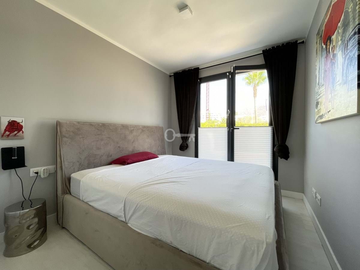 It has two bedrooms and two bathrooms, ideal for both families and couples who value space and functionality. The apartment has a 45m² private terrace and a 45m² ground floor patio, both perfect for enjoying the Mediterranean climate, the sun and the partial sea views. The property has a fully equipped open-plan kitchen, separate laundry area, air conditioning and built-in wardrobes that optimise the use of space.