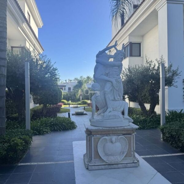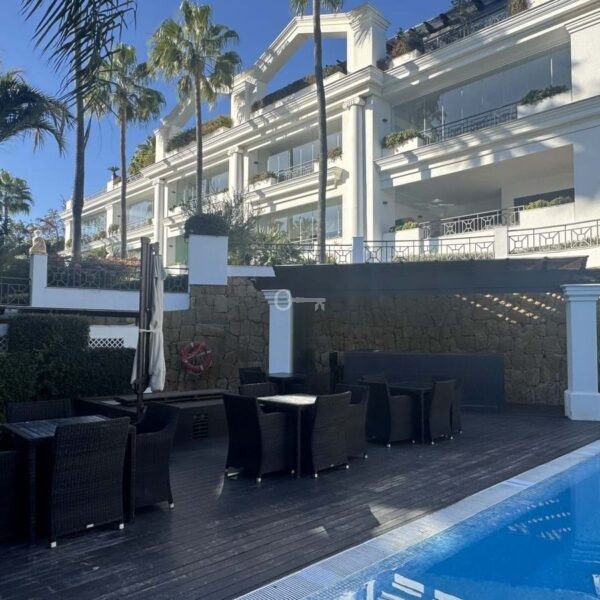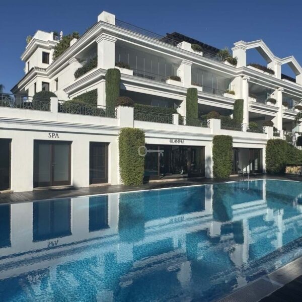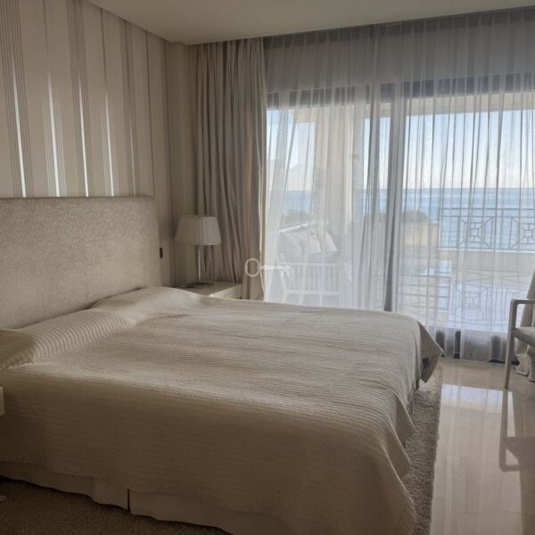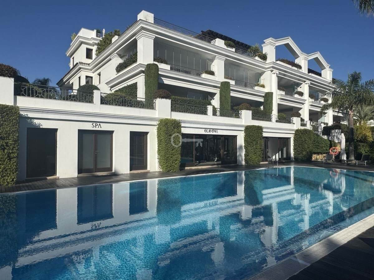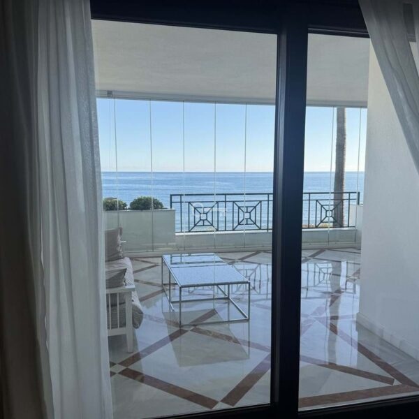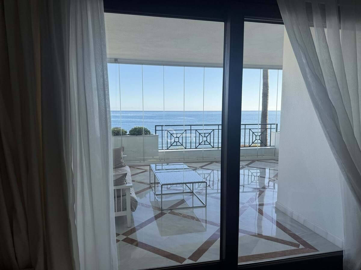 Exclusive beachfront apartment for sale in the prestigious Doncella Beach residential complex, located on the first line of the sea in Estepona, Costa del Sol.