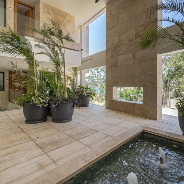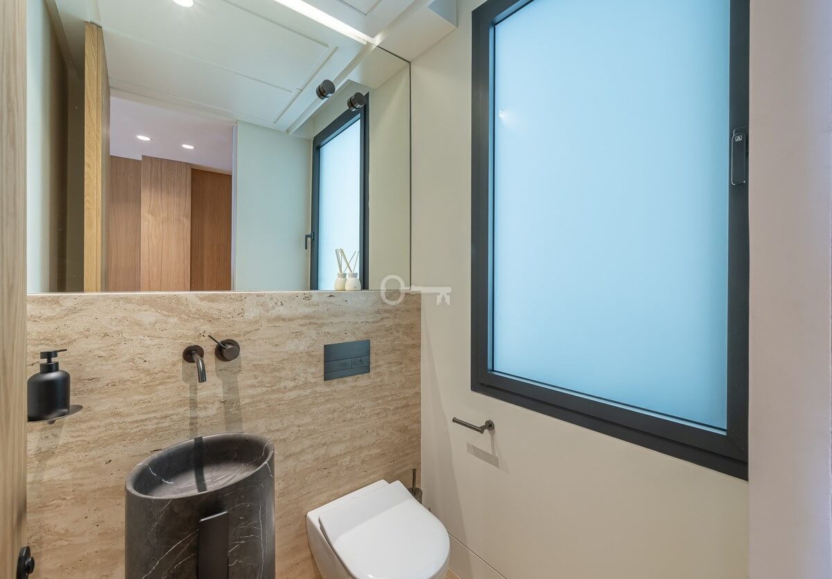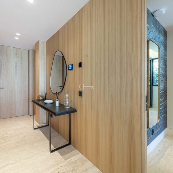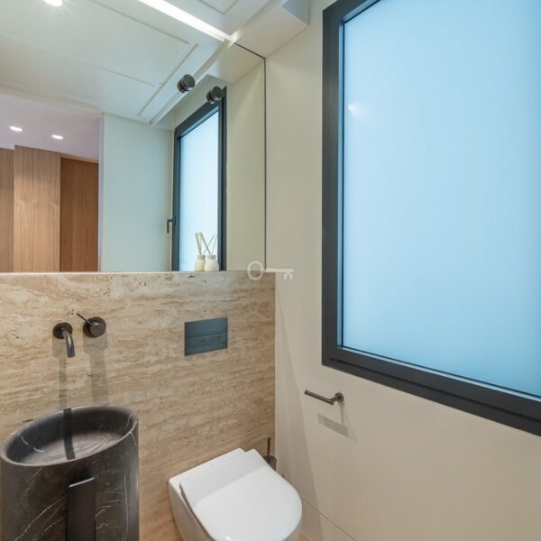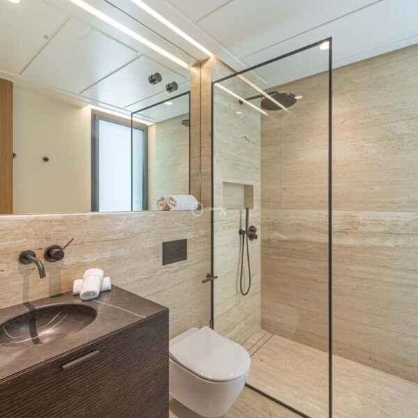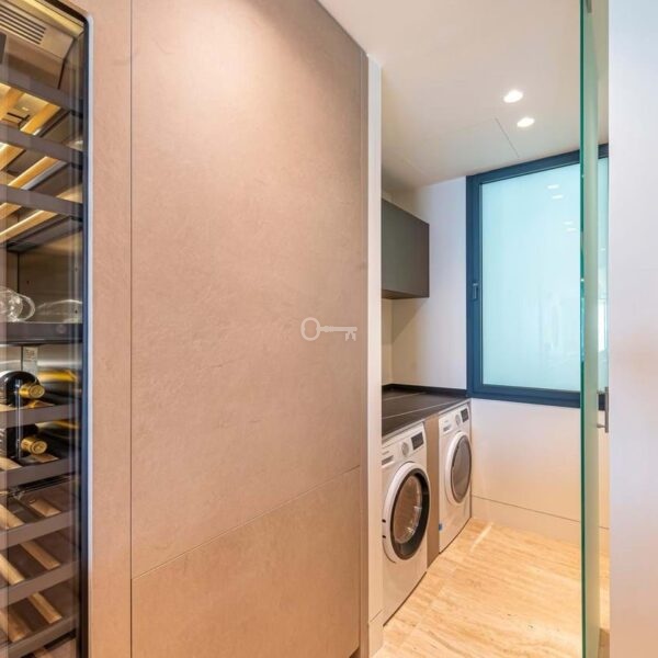 Spanning an impressive 104m² of interior space, the apartment features two generously proportioned bedrooms and two meticulously designed bathrooms. The fully fitted kitchen, equipped with high-end appliances, flows seamlessly into the open-plan dining and living areas, creating a perfect space for entertaining or relaxation. Premium finishes, including marble flooring, double glazing, and glass doors, enhance the sophisticated aesthetic, while the home automation system, central heating, and air conditioning ensure year-round comfort. Additional highlights include a utility room, storage room, and a private garage.